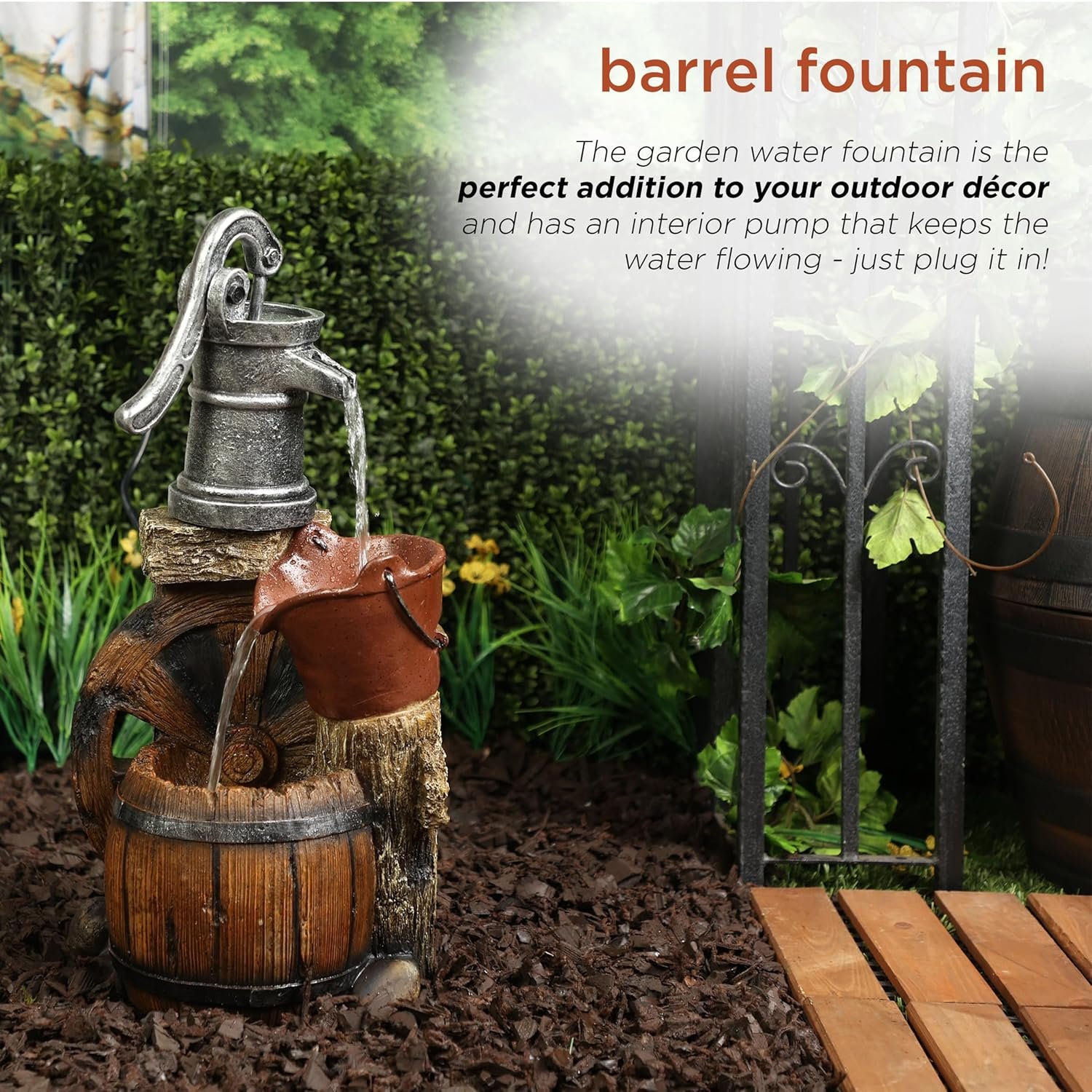 BARREL FOUNTAIN: Garden water fountain is the ideal addition to your outdoor decor, and has an interior pump that keeps the water flowing, just plug it in.