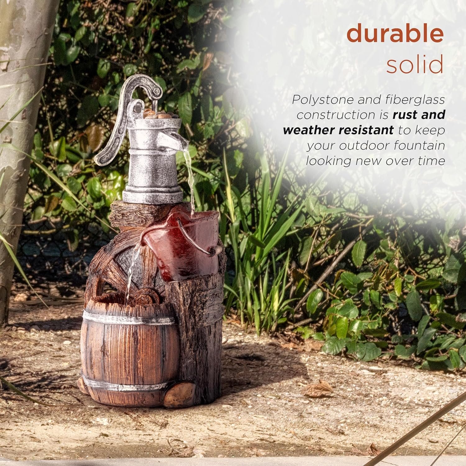DURABLE: Polystone and fiberglass construction is rust and weather resistant to keep your outdoor fountain looking new over time.