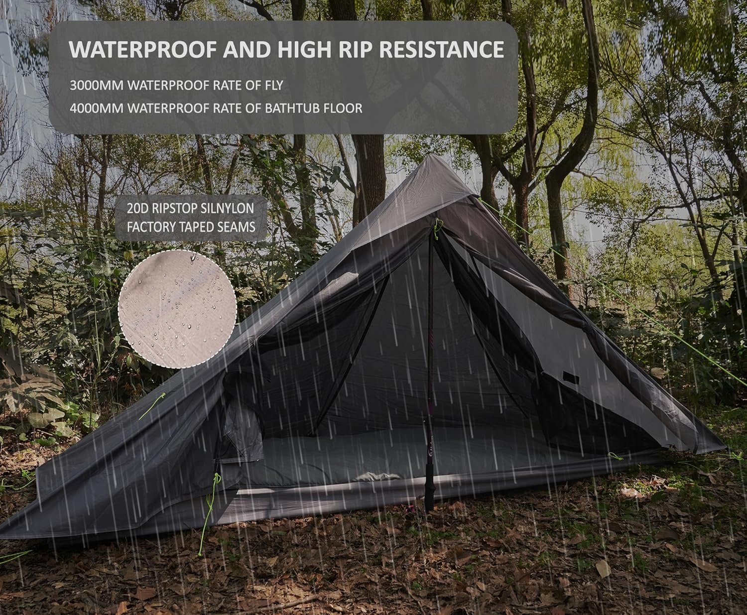 WATERPROOF SIL NYLON TENT: The shelter is made of 3000mm waterproof 20D Ripstop Silnylon which is seam sealed to prevent water leaks. Waterproof snag free SAB zippers for increased weather protection.