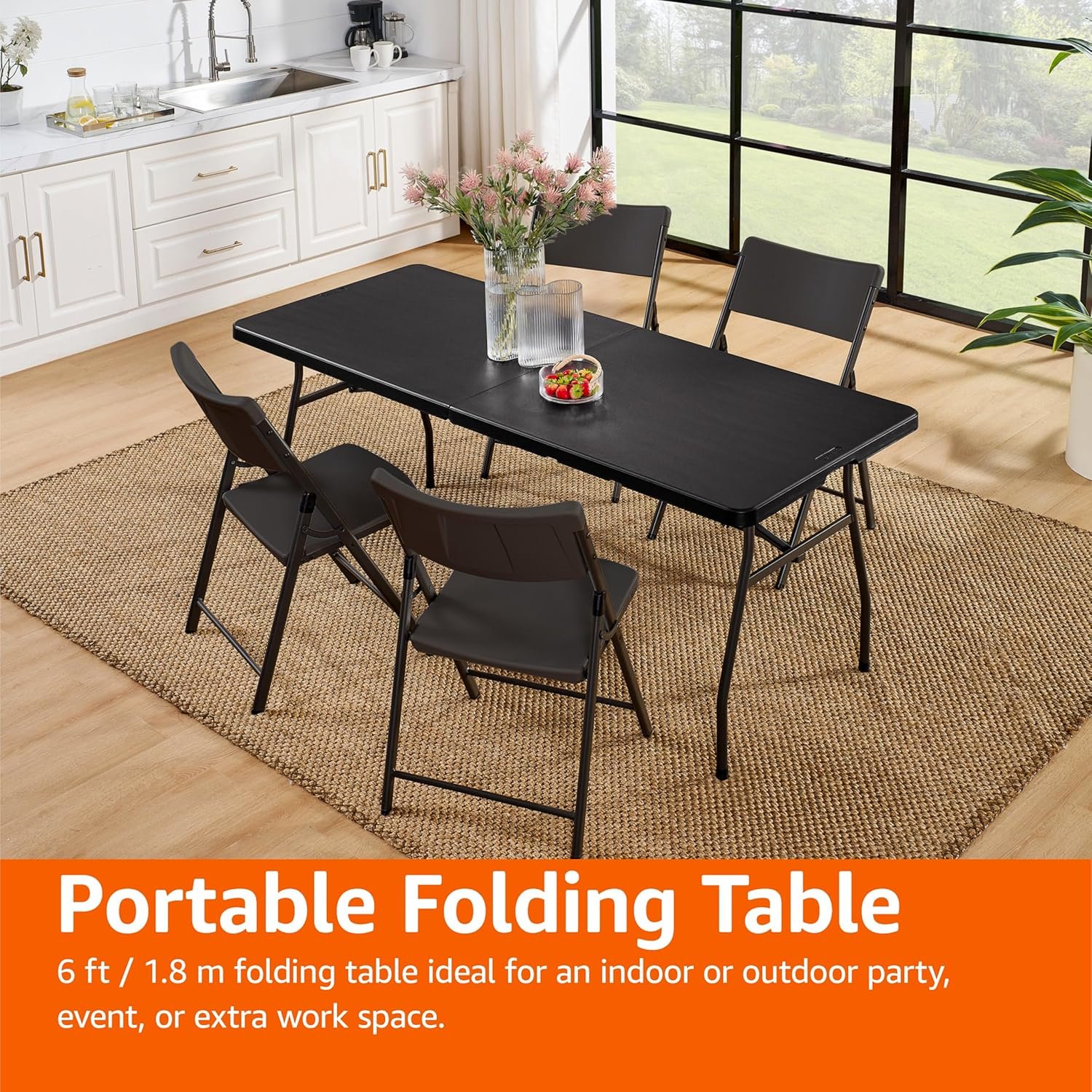 6-foot folding table in Black; ideal for an indoor or outdoor party, event, or extra work space