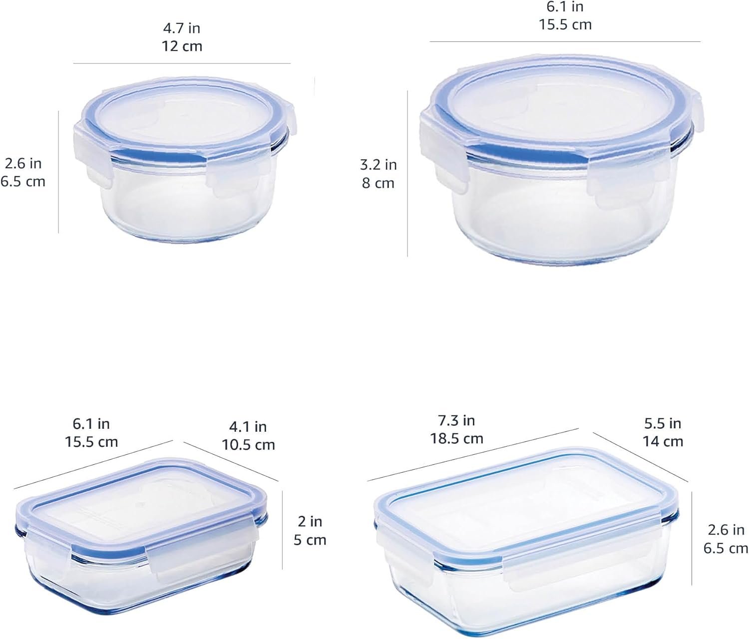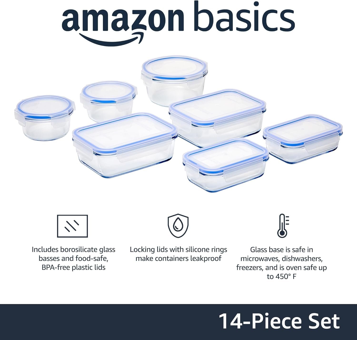 Amazon Basics Leak-Proof Glass Locking Lids Food Storage Containers, 14-Piece Set, 7 Count of Bases and 7 Plastic Lids, Clear, Blue, BPA Free, Dishwasher & Microwave Safe, for Meal Prep & Freezer
