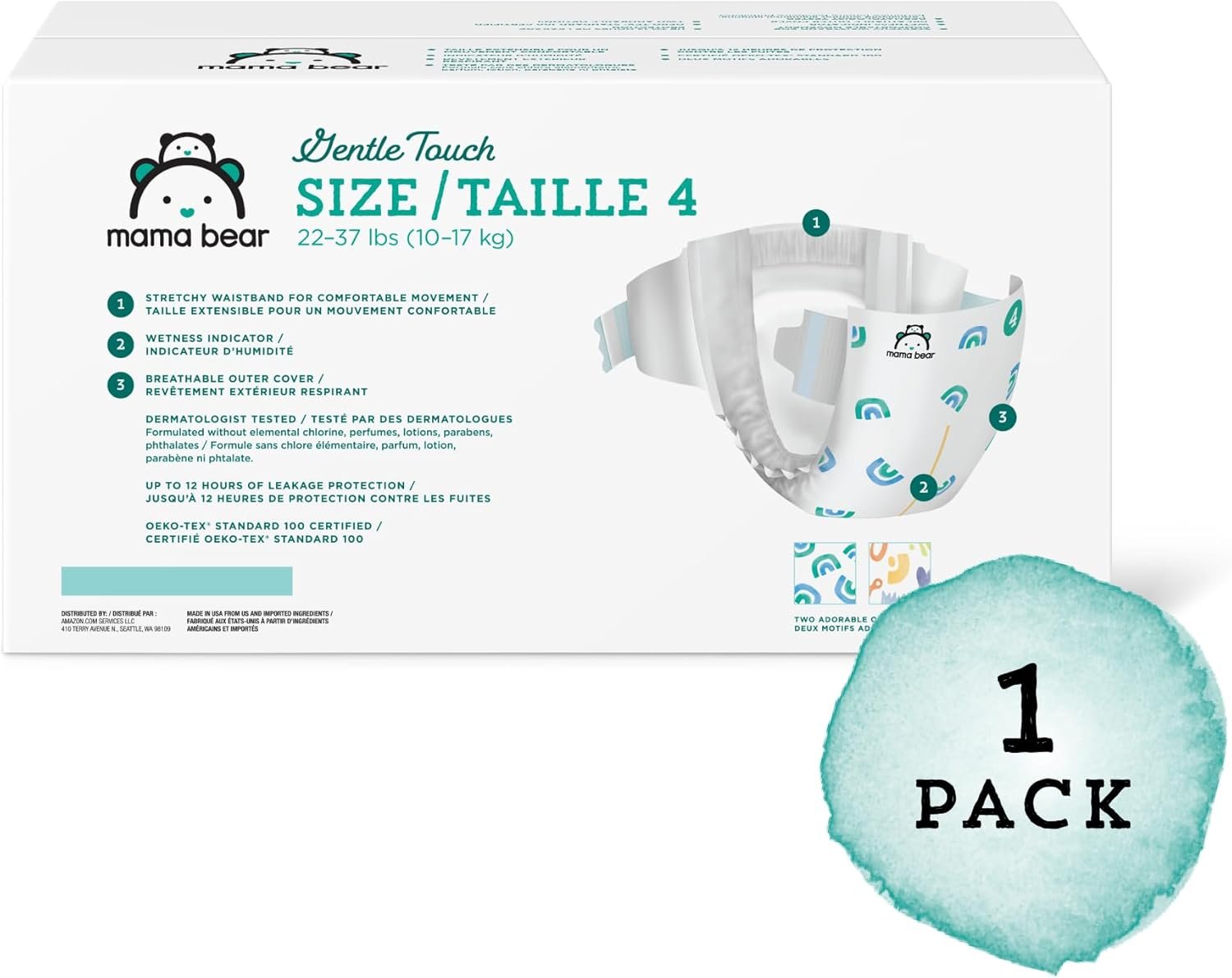 IN THE BOX: Mama Bear Gentle Touch Diapers for babies 22–37 pounds; size 4; (4 packs of 37 diapers each, 148 total)