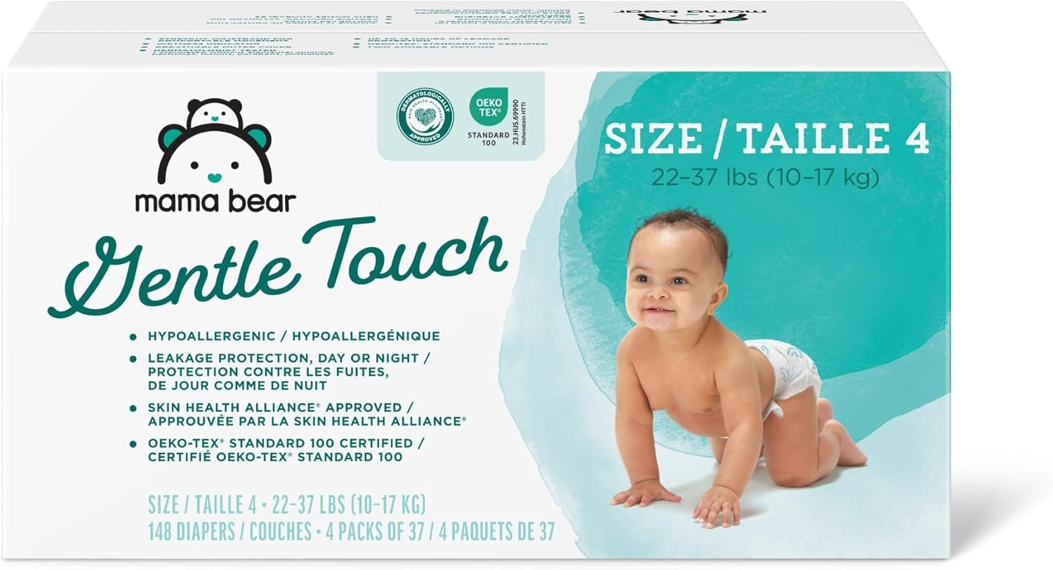 Amazon Brand – Mama Bear Gentle Touch Diapers, Hypoallergenic, Size 4, 148 Count, 4 Packs of 37, White