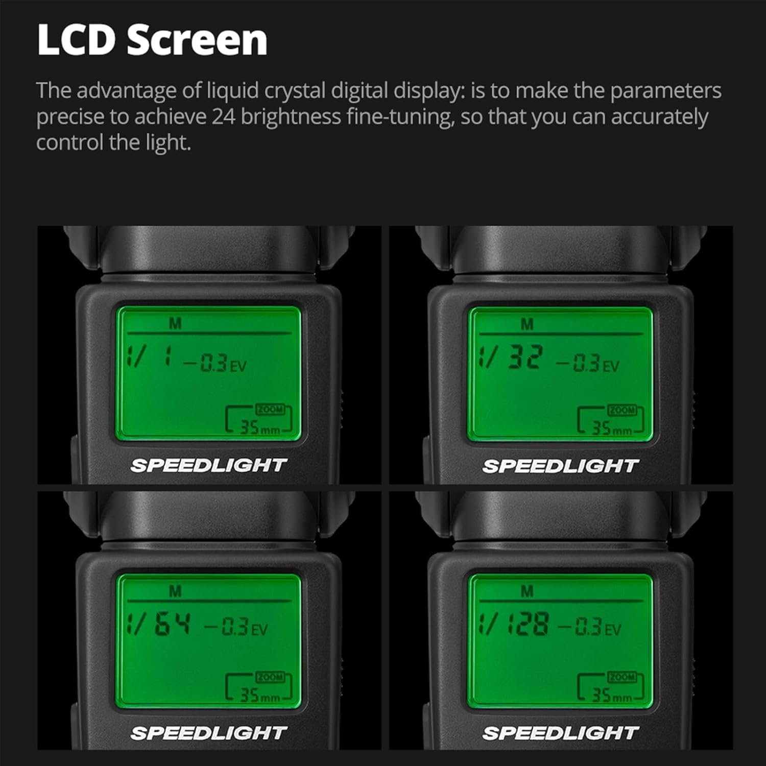 【Adjustable Flash Head】 You could enjoy the creative freedom and adjust the camera flash head ‘s 0-270-degree horizontal rotation and 0-90-degree vertical tilt,enabling you to shot more stunning photos from diverse lighting angles.And this flash adopts fresnel lens with strong focus.
