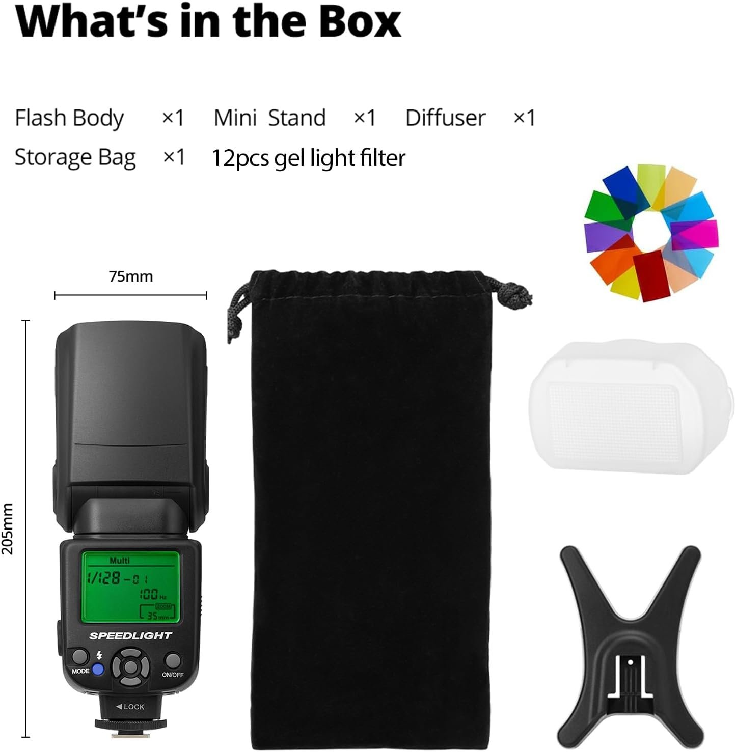 【Package Included】AMBITFUL AF970 camera flash weights only 390g/0.86lb , with dimension 6*20.5*7.5cm/2.36*8.07*2.95 inch. The pacakge includes: camera flash*1, mini stand*1 diffuser*1,storage bag*1,extral 12pcs gel light filter