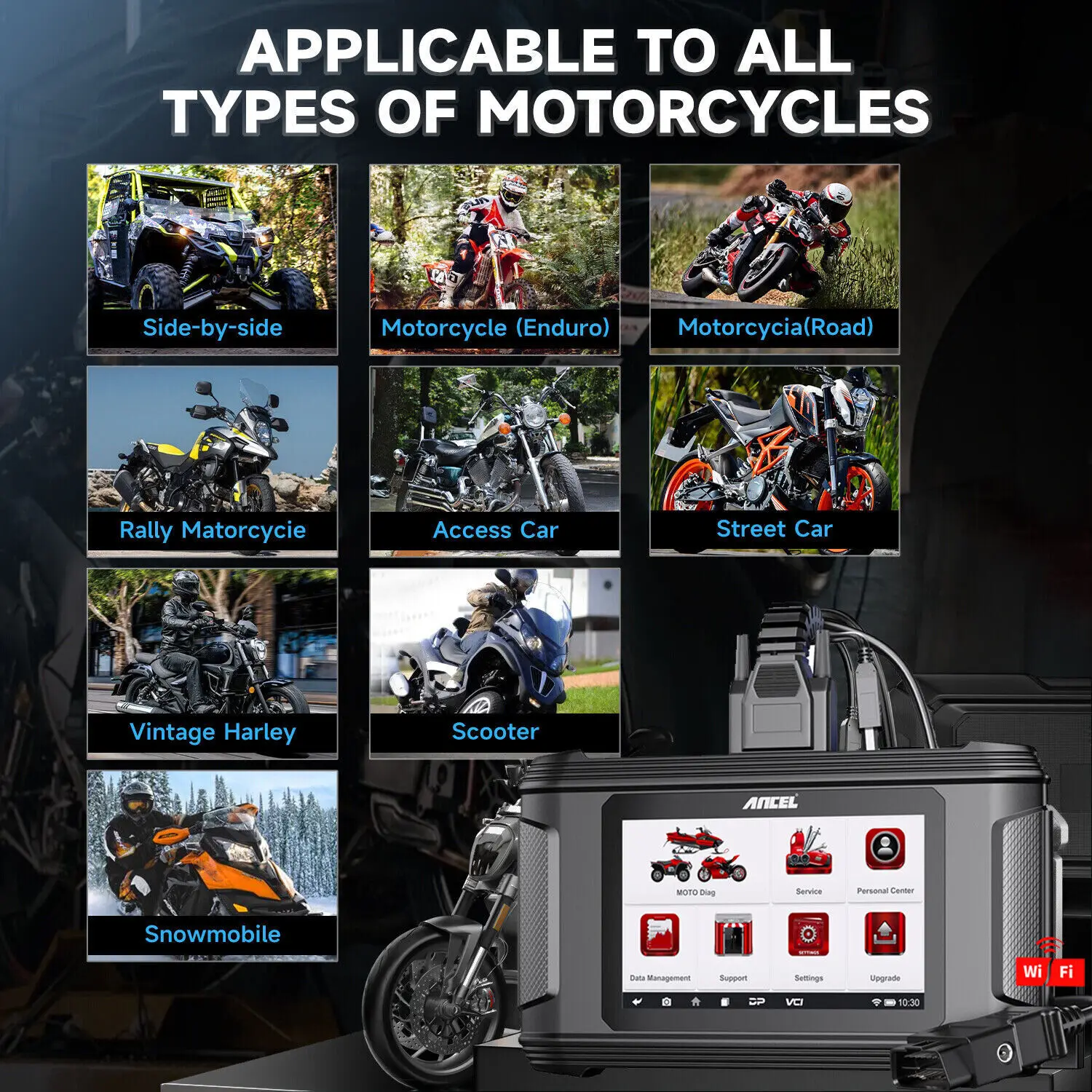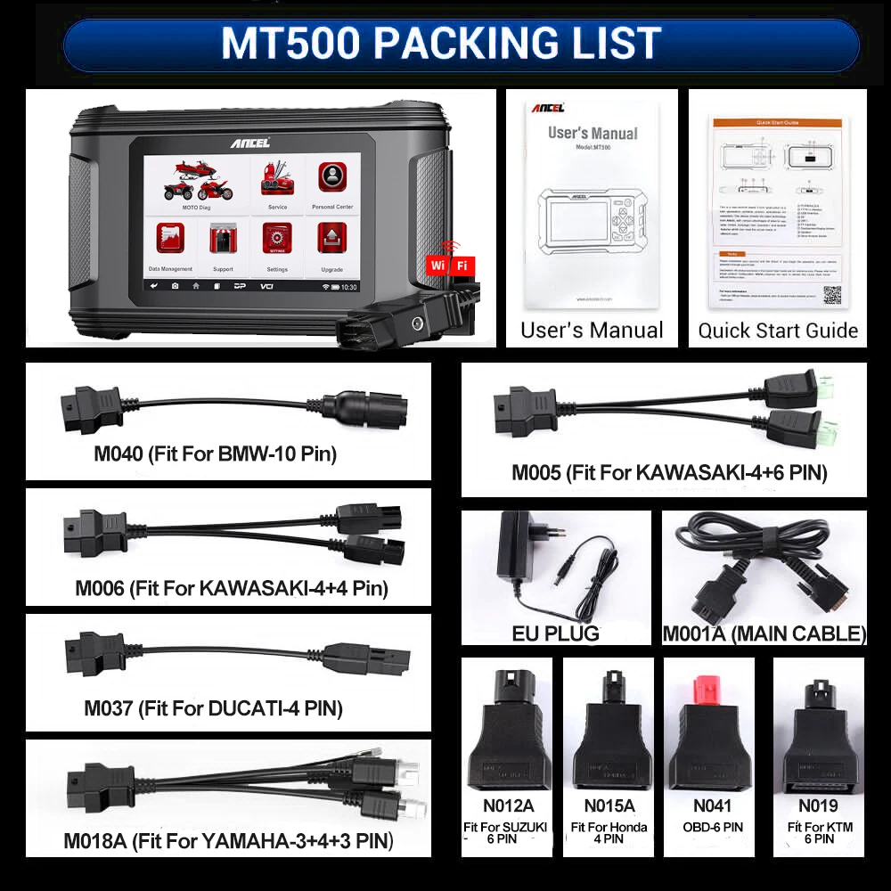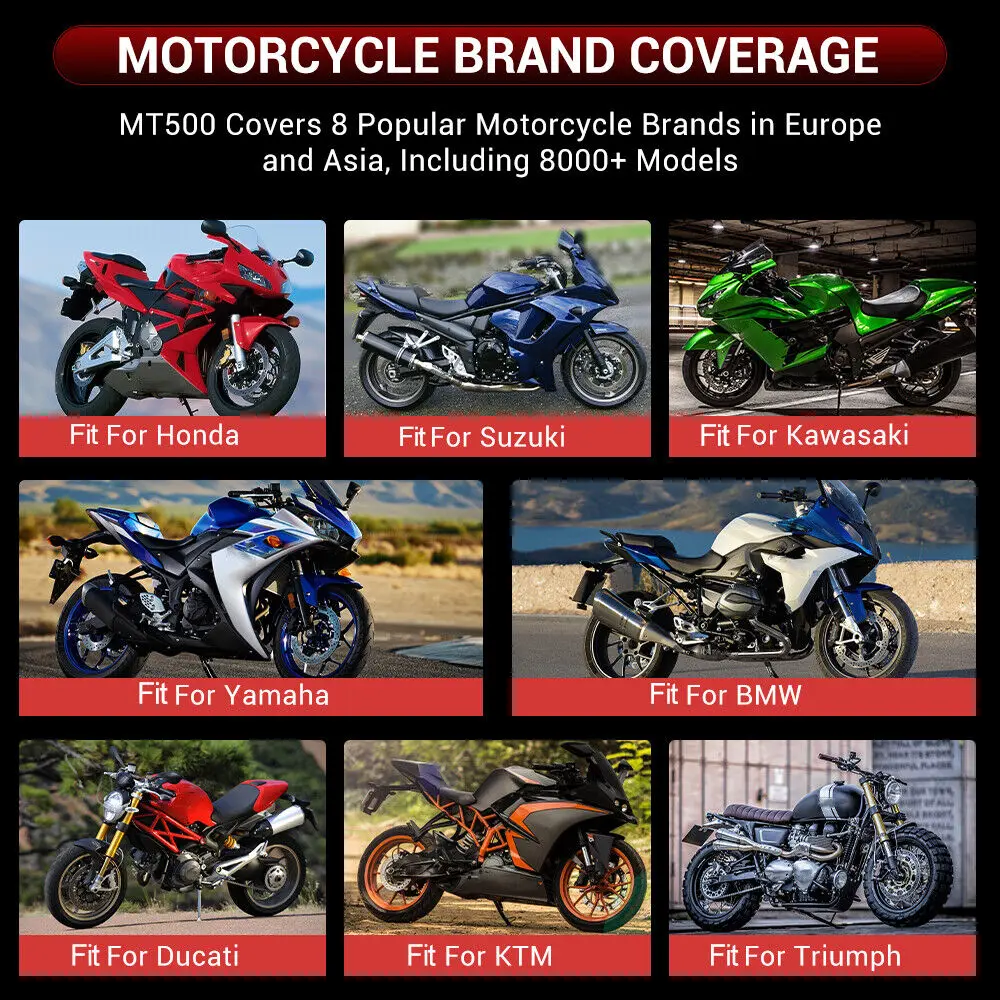 ANCEL MT500 is compatible with HONDA/SUZUKI/KAWASAKI/YAMAHA/BMW/DUCATI/KTM/TRIUMPH motorcycle models, for various types of motorcycles such as standard, ATV, UTV, scooter, snowmobile, touring, cruiser, sport bike, off-road.