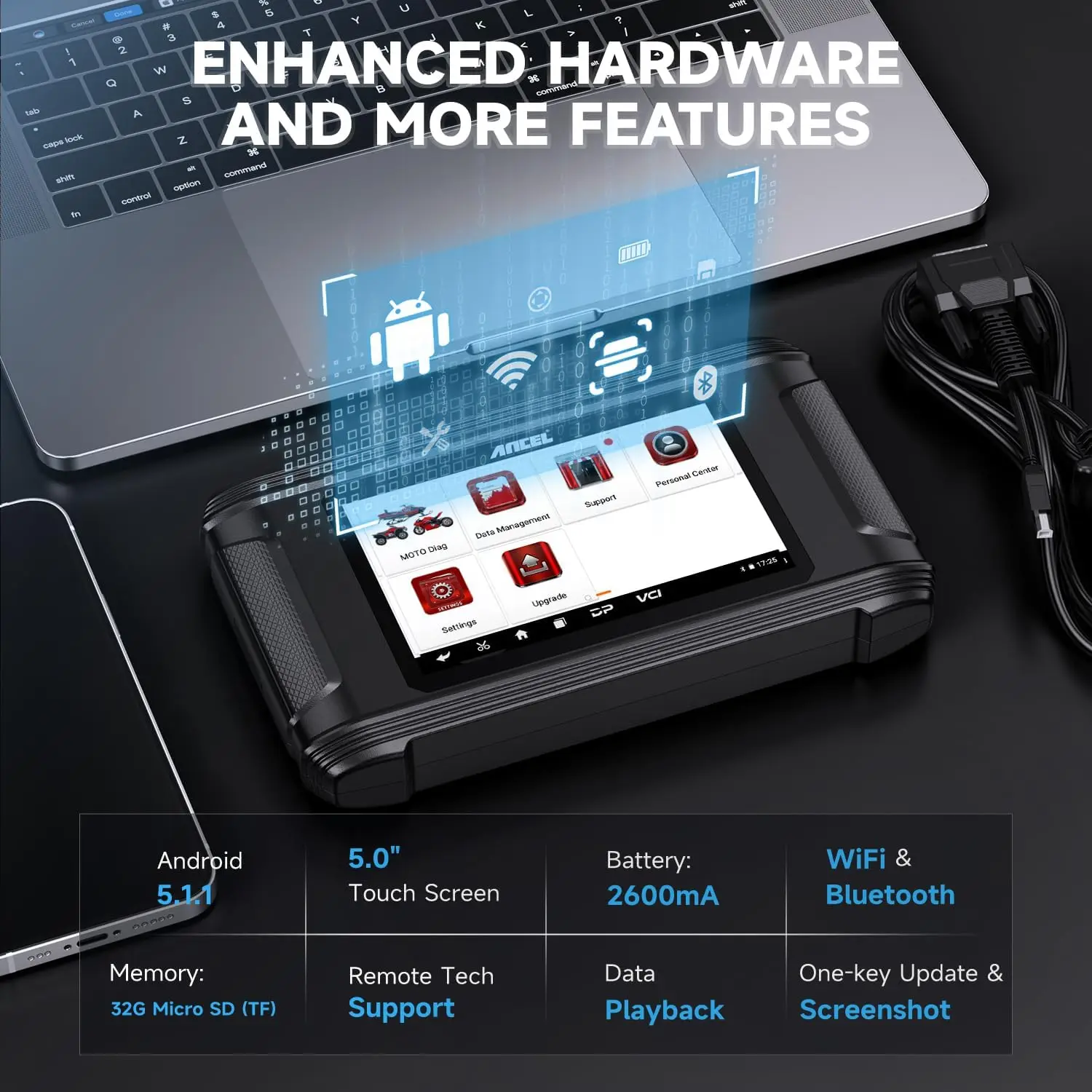 ● The large memory of 16GB ROM helps to improve the running speed of the diagnostic tool.