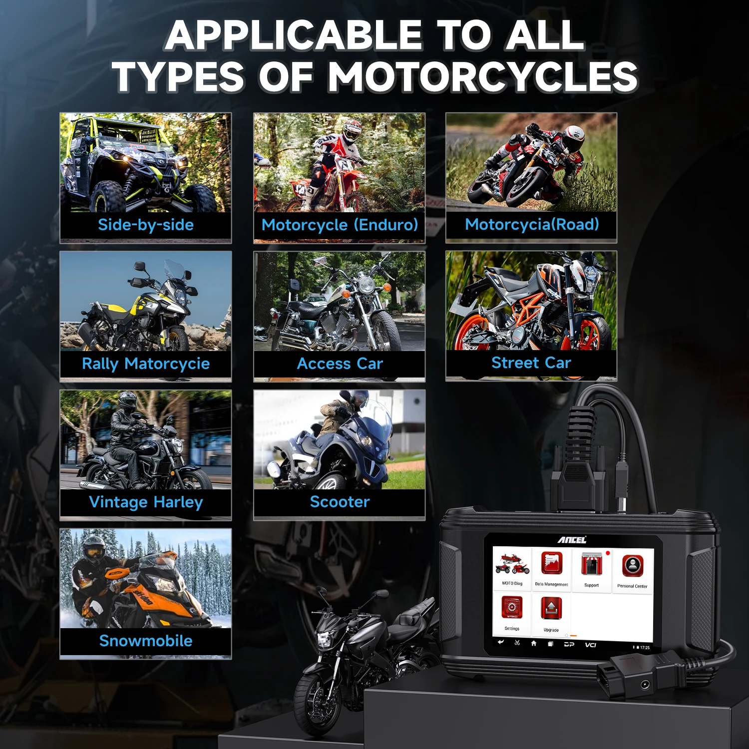 ANCEL MT500 is compatible with HONDA/SUZUKI/KAWASAKI/YAMAHA/BMW/DUCATI/KTM/TRIUMPH motorcycle models, for various types of motorcycles such as standard, ATV, UTV, scooter, snowmobile, touring, cruiser, sport bike, off-road.