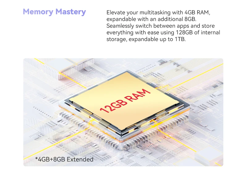 Elevate your multitasking with 4GB RAM, expandable with an additional 8GB. Seamlessly switch between apps and store everything with ease using 128GB of internal storage, expandable up to 1TB.