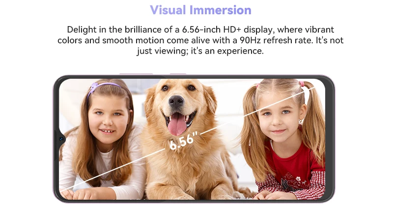 Delight in the brilliance of a 6.56-inch HD+ display, where vibrant colors and smooth motion come alive with a 90Hz refresh rate. It’s not just viewing; it’s an experience.