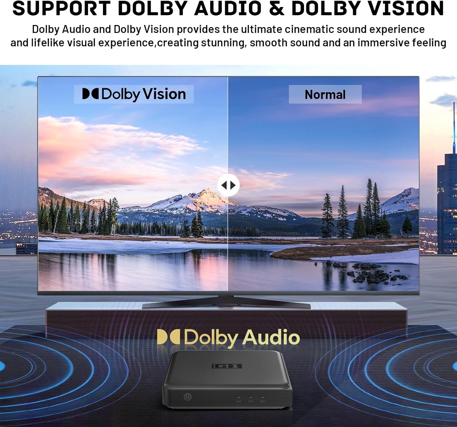 [Super Shocking Audio-Visual Feast]G1 Android box 4k features the latest 4K HDR 10+ and AV1(30% higher compression efficiency than H.265 or VP9) decoding technology,providing real 4K@60fps playback without stuttering or buffering.Plus Dolby Vision and Dolby Digital Plus,let you enjoy an immersive audio-visual feast at home.Built-in Chromecast allows you stream movies/pictures/games and apps from your phone,tablet or laptop right to the big screen.