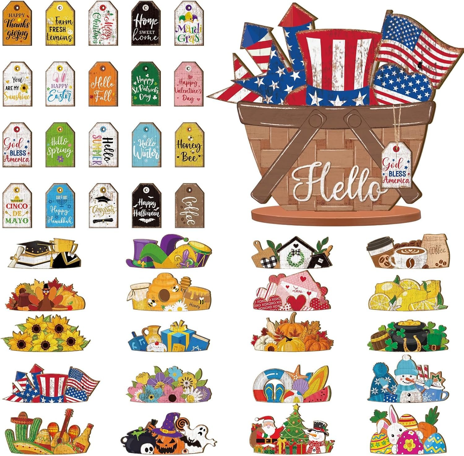 Anglechic 42 Pcs Interchangeable Flower Basket Seasonal Sign Patriotic 4th of July Holiday Tier Tray Decor Set Farmhouse Rustic Replaceable Wood DIY Hanging Drop Home Desk Welcome Ornament Gift