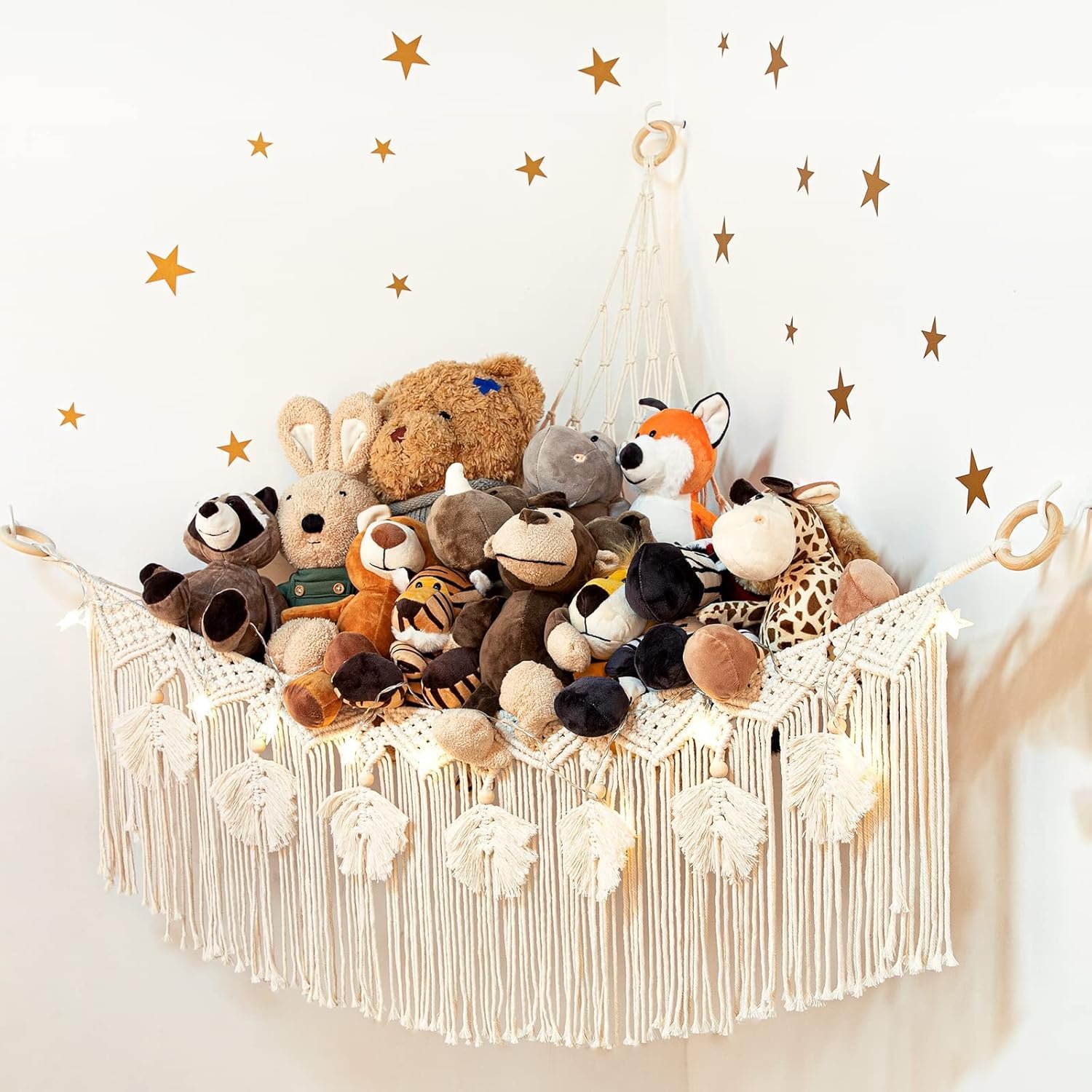 ANROYE Macrame Stuffed Animal Toy Net Hammock with Star Light, Small Plushies Boho Storage for Nursery, Corner Wall Hanging Organizer for Kid, Bohemian Woven Decor Display Holder for Girls Boy Gift