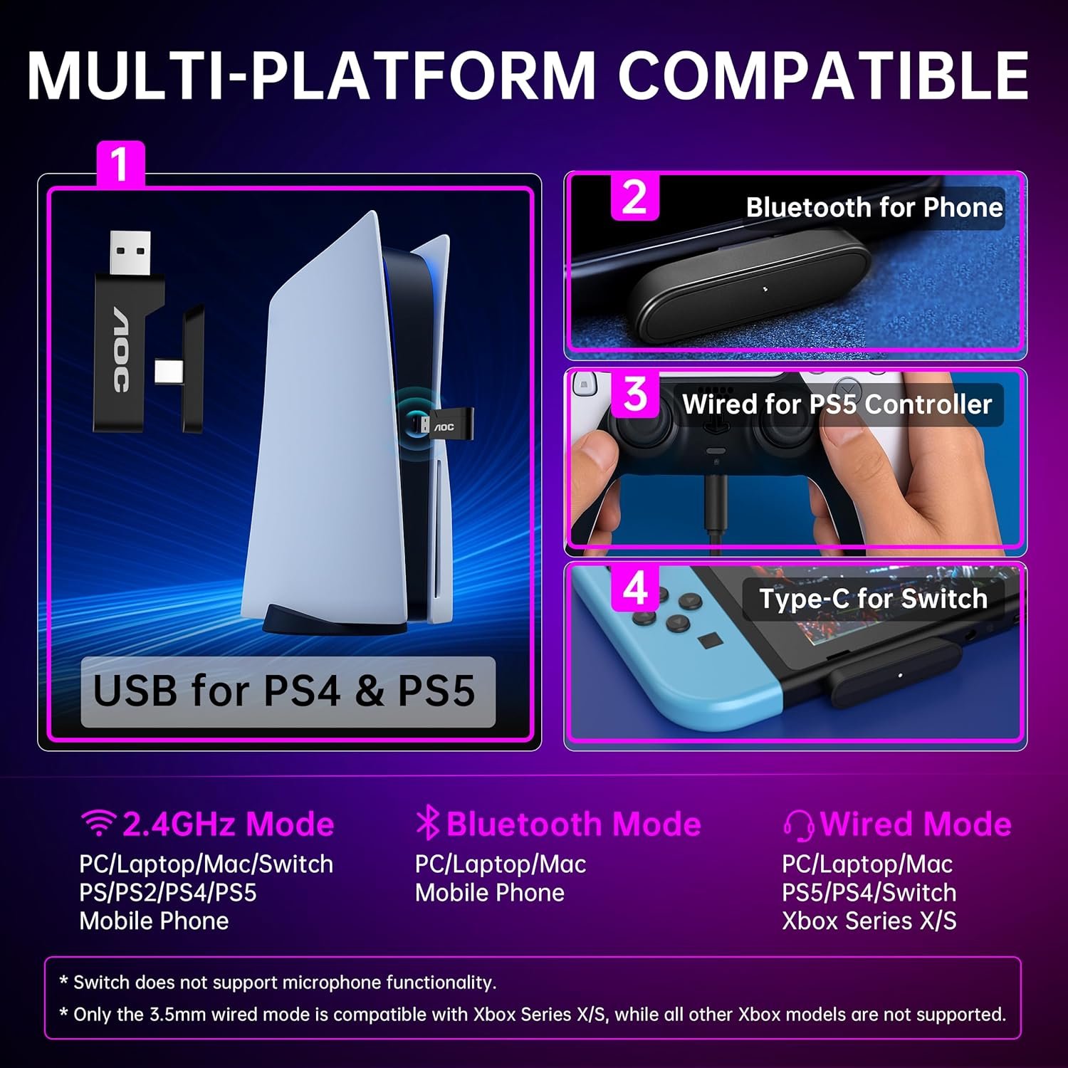 【4-in-1 Universal Connectivity】AOC PS5 Headset is equipped with USB-A, Type-C, Bluetooth 5.4, and 3.5 mm wired modes, this single gaming headset wireless plugs into consoles, mobile devices, and more—eliminating the need for multiple adapters or extra purchases. * Bluetooth modes are incompatible with PS5, PS4.