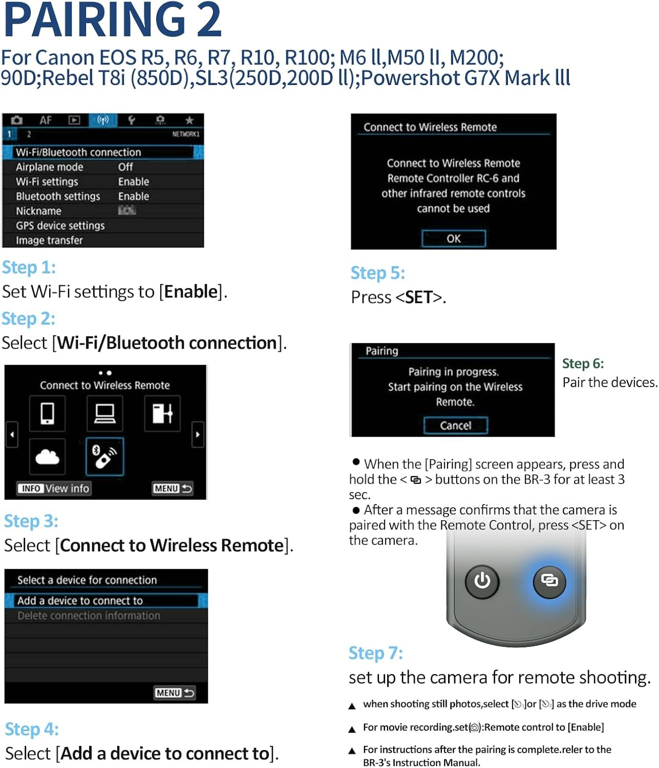 Suitable for Multiple Models: AODELAN shutter release just compatible with Canon R3, RP, EOS R, EOS R5, EOS R6, R10, 6D Mark II, 77D, 800D(EOS Rebel T7i), T8i, 200D(EOS Rebel SL2), 200D II, 250D(EOS Rebel SL3), 850D, M50, M50 Mark II, M200, PowerShot SX70 HS, 90D, M6 Mark II, PowerShot G7 X Mark III, PowerShot G5 X Mark II. Pls Make sure your camera drive mode to remote mode and just can compatible with the mentioned camera models.