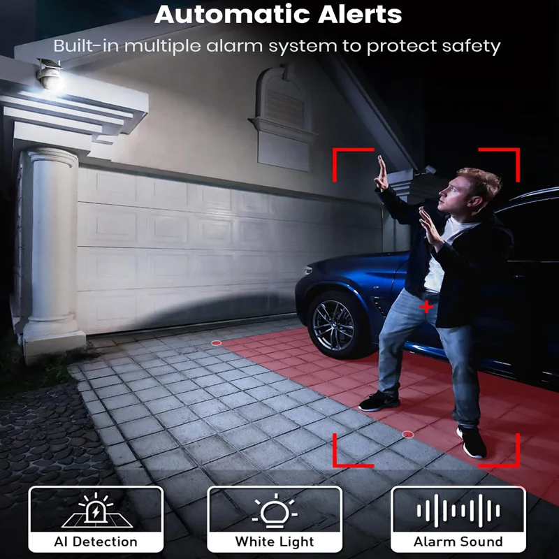 When human motion is detected, the solar security cameras wireless outdoor automatically focuses on and tracks the moving people to record a more detailed event. Enjoy peace of mind knowing that your property is under great surveillance.