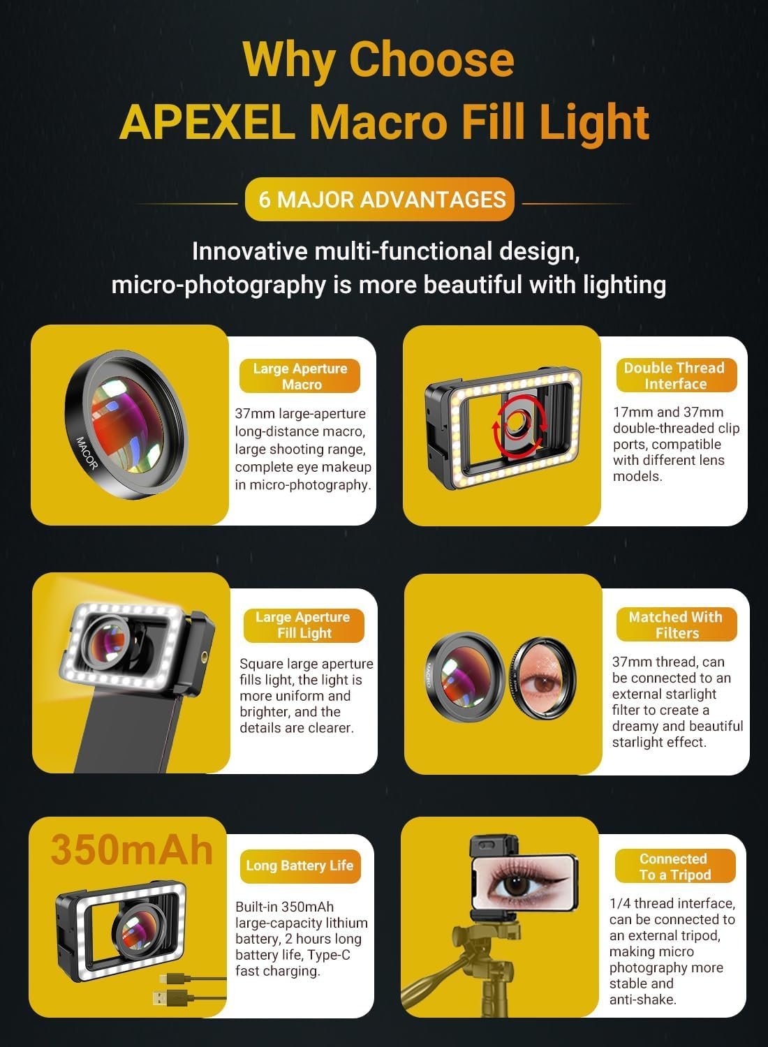 【Take you to explore the beauty of the microscopic world】The 15X apexel macro lens is designed with a large aperture, which can make point light sources present a nearly circular blur effect, bringing a soft and natural background blur effect to macro photography. Blur the background like a SLR, with 4K high-definition image quality. 1.57-2.75in golden focusing distance, 15x magnification, every detail is visible.
