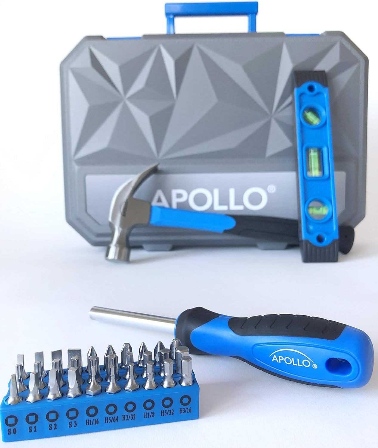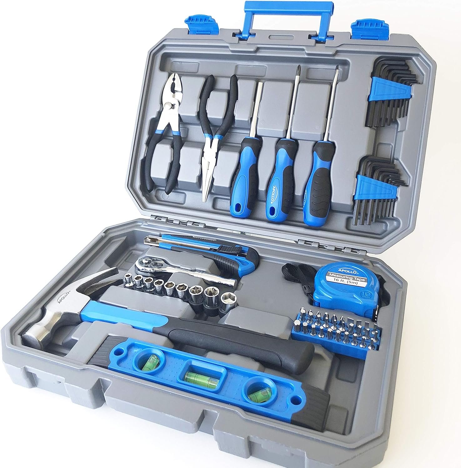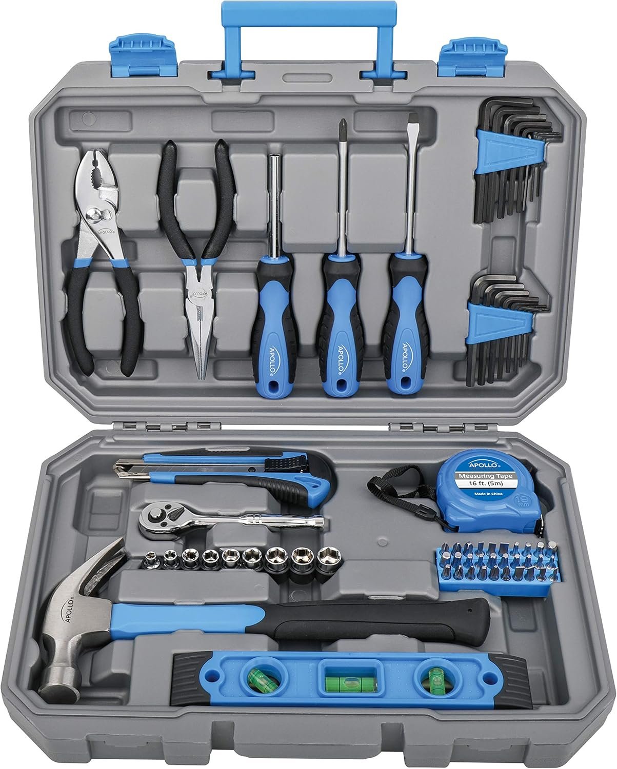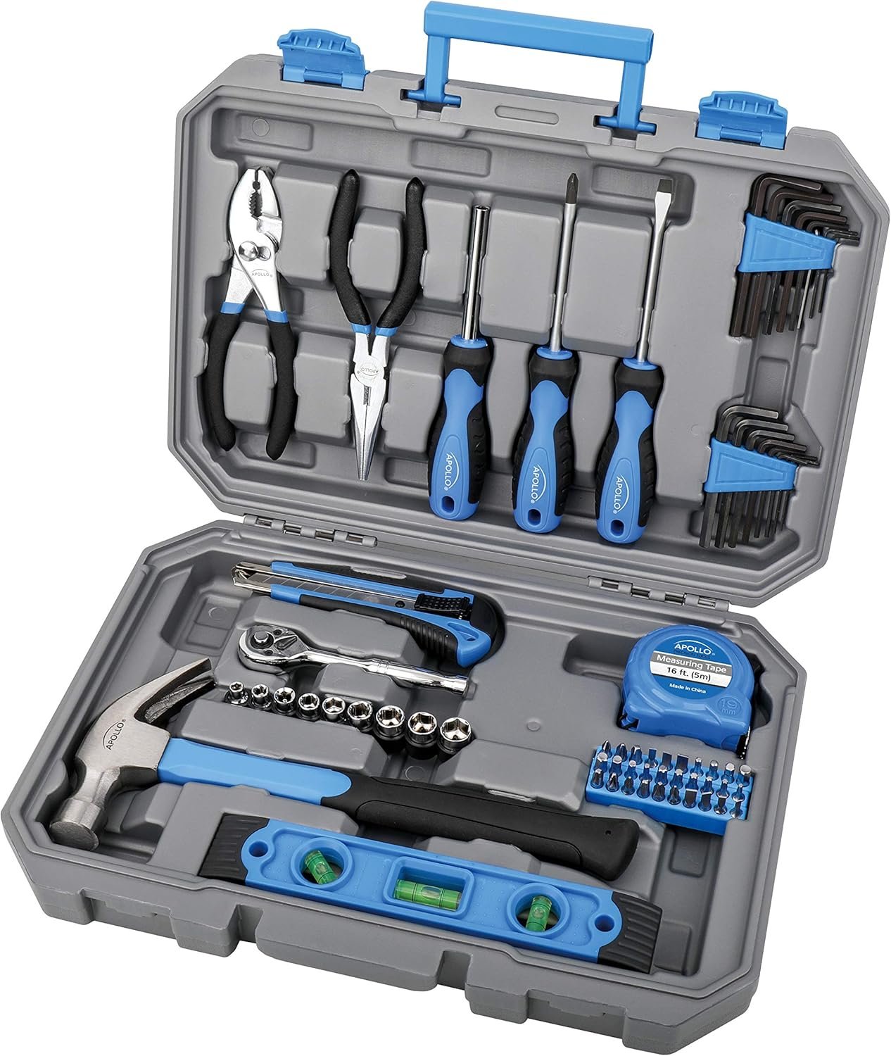 STURDY, RUGGED, WITH ALL THE ESSENTIALS: This is a compact tool set designed to satisfy the highest standards and will find its place at home for everyday repairs. This tool kit in an attractive blue color offers an essential selection of tools, with quick access to a claw hammer, a level, a 16-foot tape measure, a screwdriver set (Phillips and slotted), two essential pliers (slip joint and long nose) with double-dipped handle for grip comfort, a box cutter, a 72-teeth ratchet handle and a 9-piece socket set, two sets of hex keys, in metric and SAE. And an extensive bit selection so you’ll always have the correct bit for the task at hand. This is the easy-to-carry, easy-to-store basic tool set you will love for tasks big and small at home, the office, and in the garage.