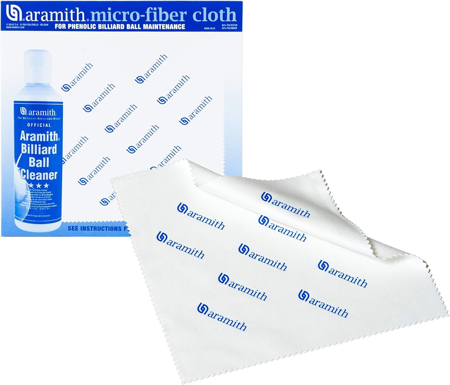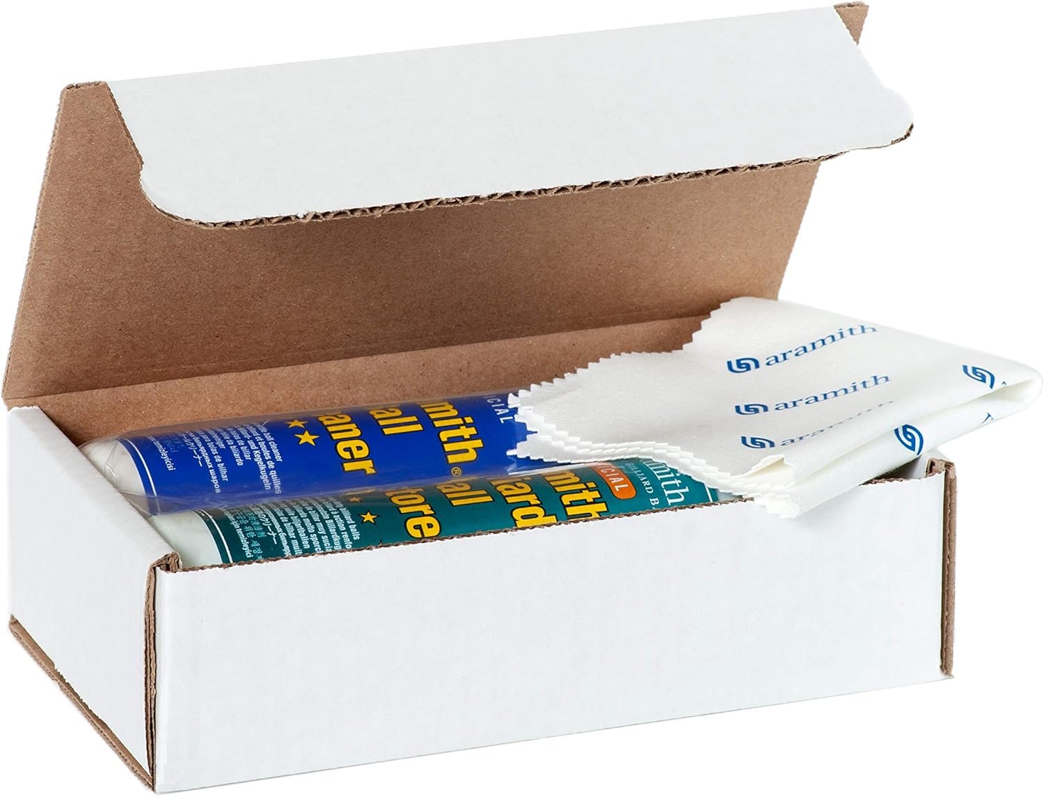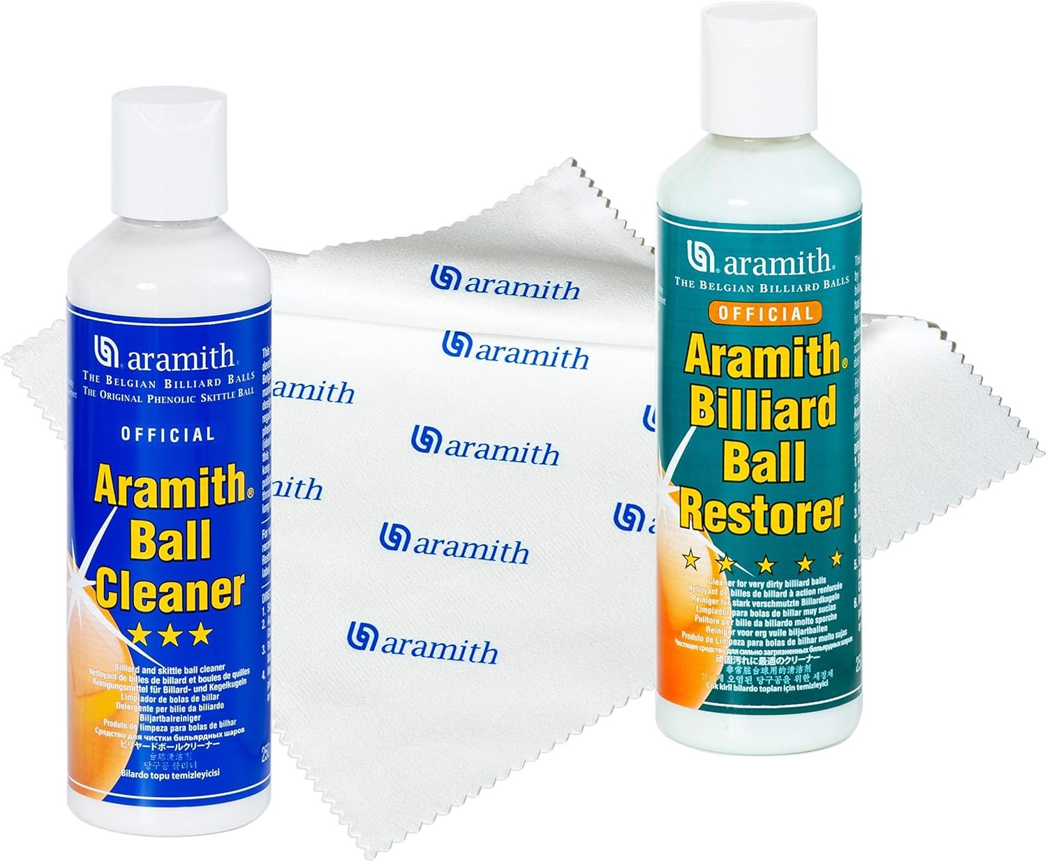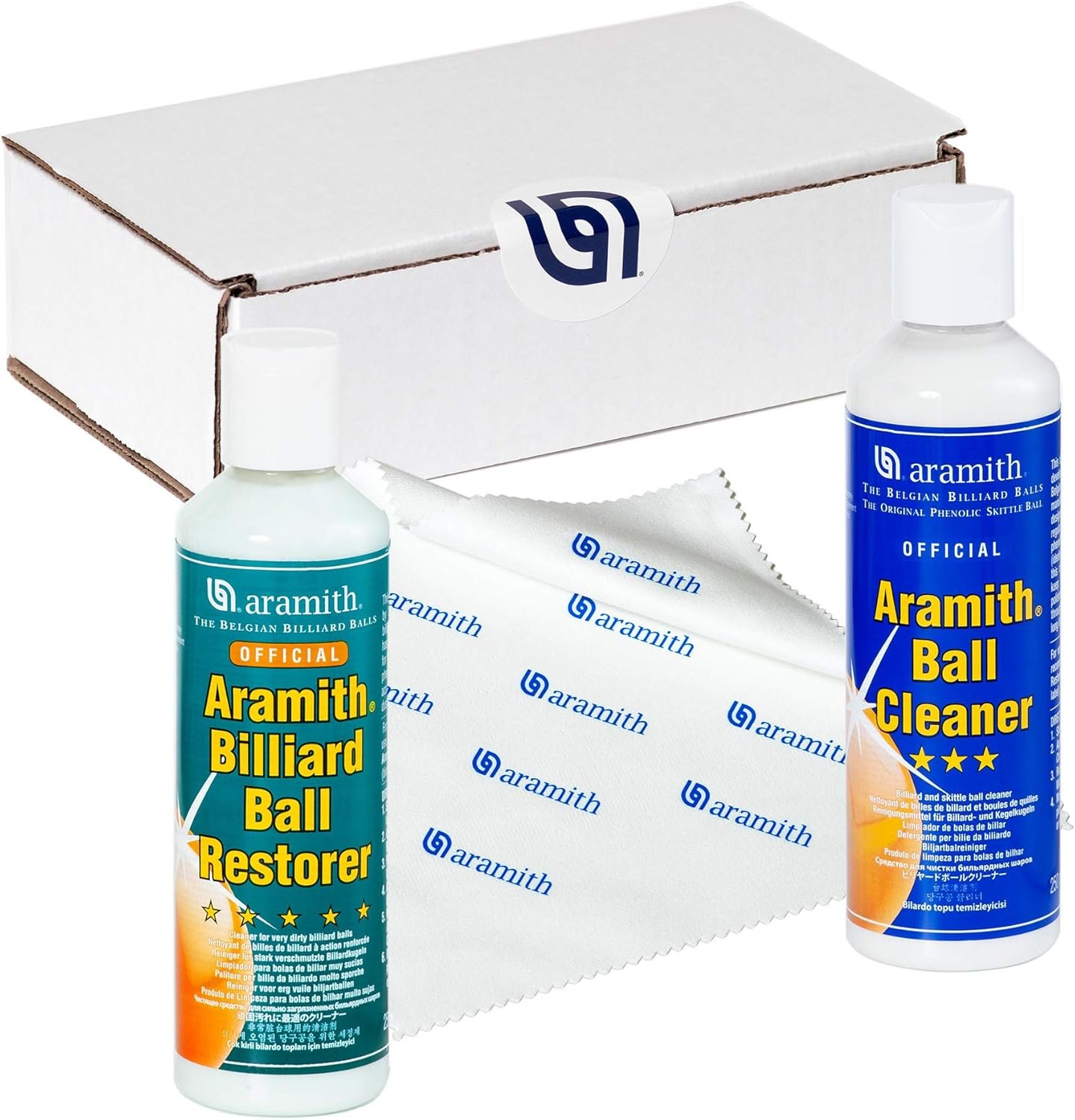 Bundle includes 3 items: Aramith Billiard Ball Cleaner, Aramith Billiard Ball Restorer 8.4 fl.oz. bottles & Aramith Microfibre Cloth (size: 7 1/8″ x 7″), packed in a durable white corrugated box with Aramith logo