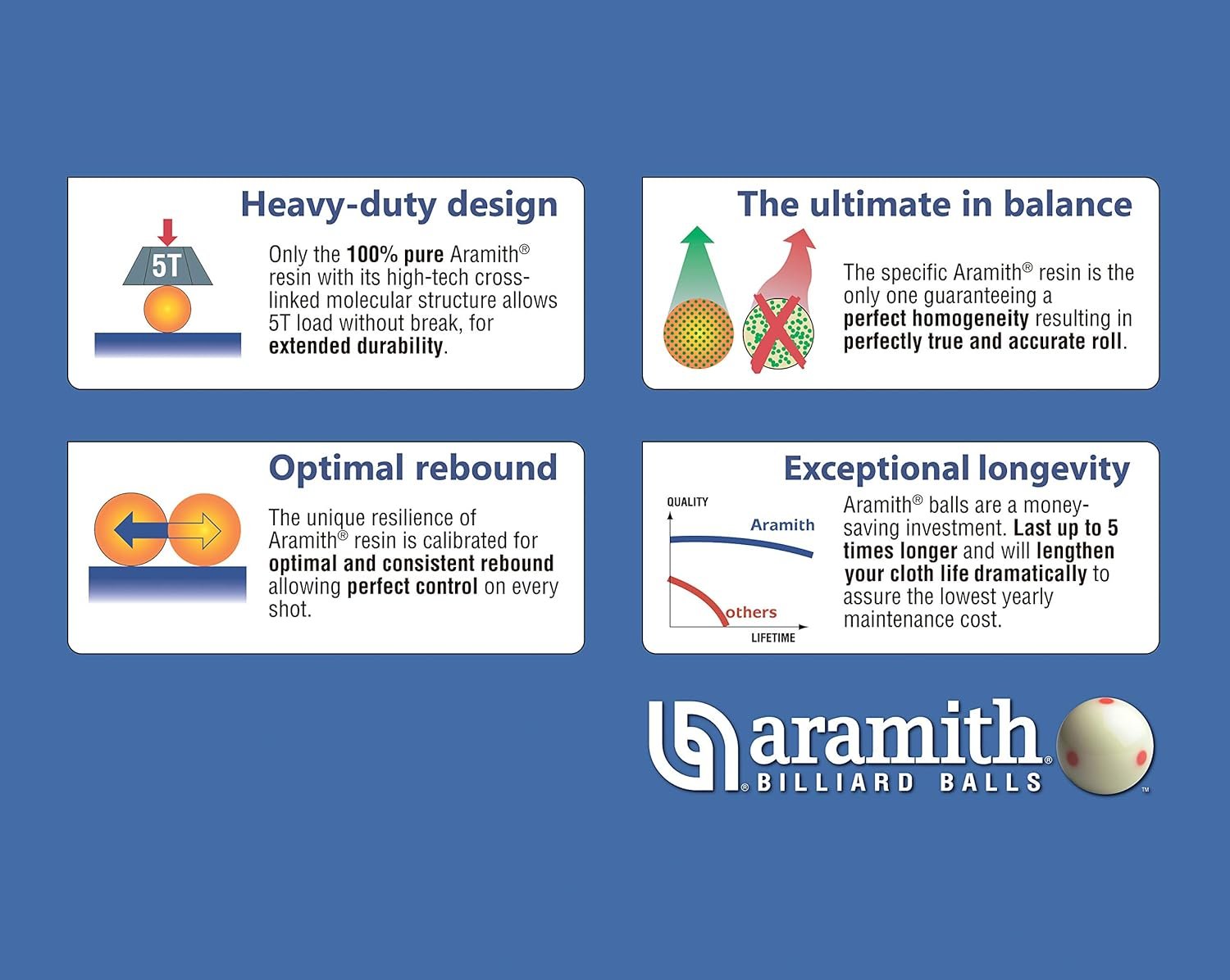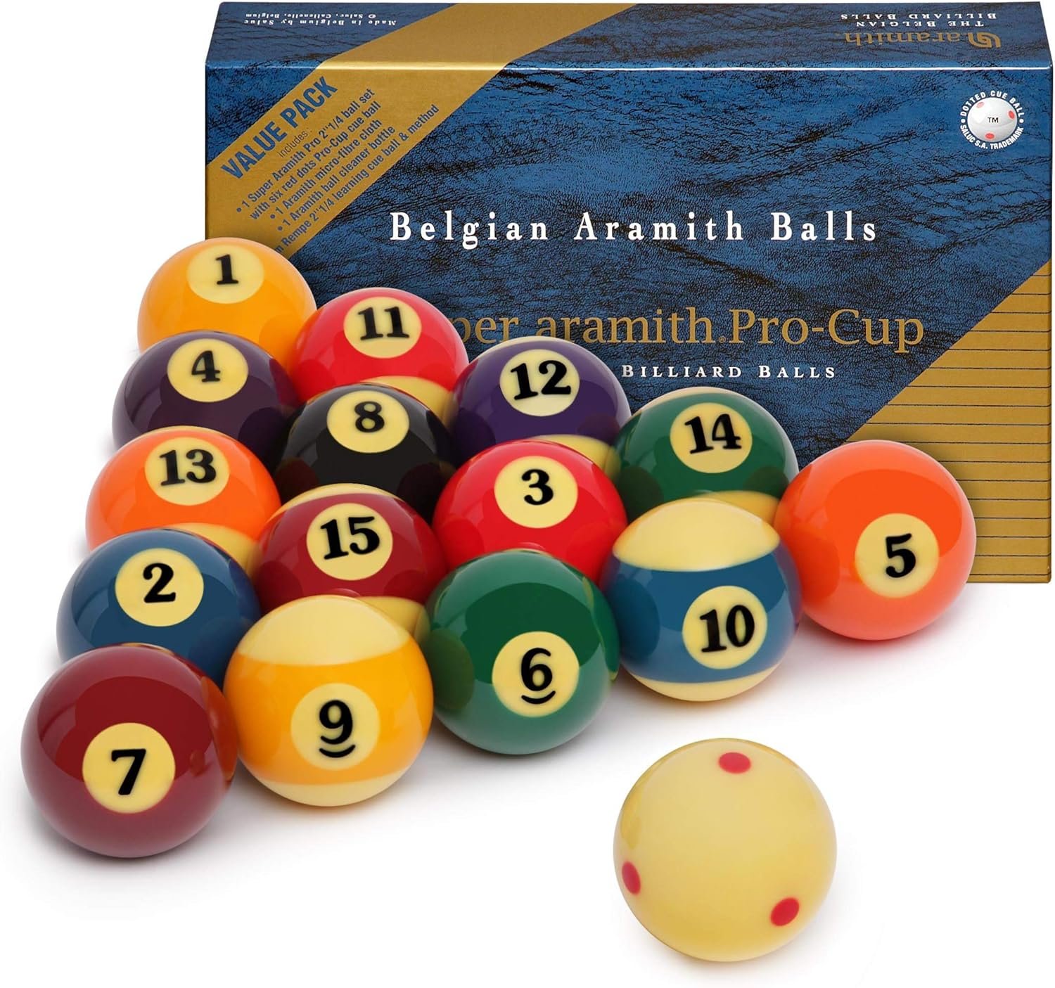 Super Aramith Pro Ball set: MATCHED PROFESSIONAL SET: Precise calibration of each ball for maximum consistency within the setWorldwide endorsement: Professional grade Aramith phenolic resin, widely used in tournaments worldwide. LOWEST YEARLY TABLE COST: Extra durable smooth surface that minimizes table cloth wear for an exceptional cloth and ball longevity. OUTSTANDING ENDURANCE: Through hardened vitrified surface with ultra-high density for exceptional scratch and impact resistance