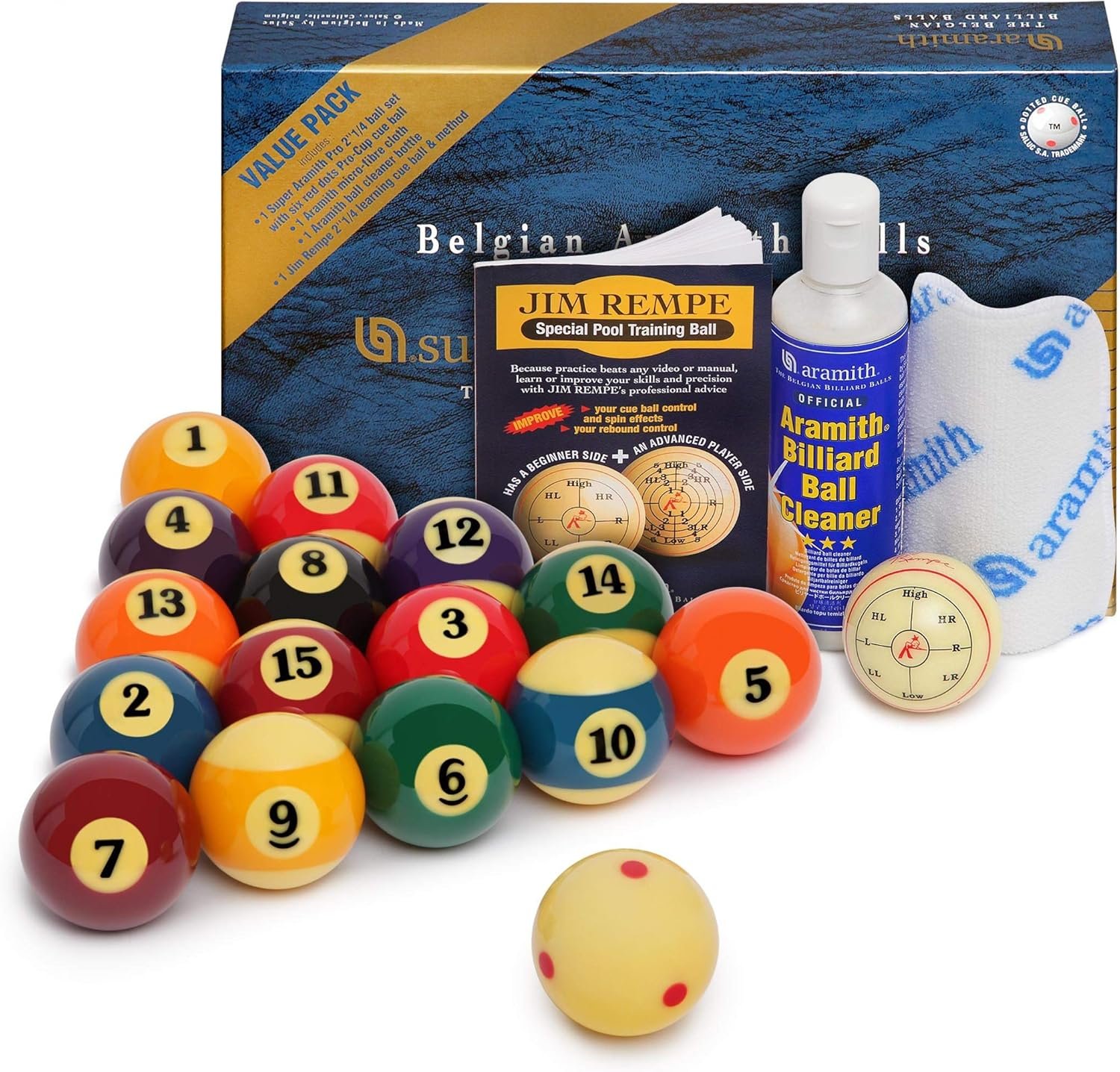 This Value Pack includes: Super Aramith Pro Billiard Pool Ball set 2 1/4″ with Six Red Dots Pro-Cup Cue Ball, Aramith Micro-Fibre Cloth, Aramith Billiard Ball Cleaner, Jim Rempe 2 1/4″ Training Ball