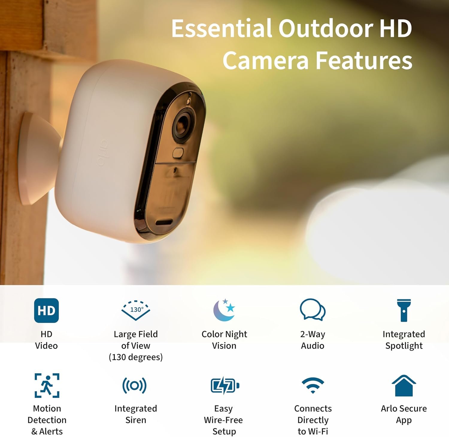 For security cameras wireless outdoor, the Essential Outdoor Camera provides smart home security with clear HD resolution. Perfect cameras for home security outside, you can watch and record video in 1080p High Definition. Get alerts and watch live video on your phone from your wireless security camera. Ward off intruders with the Integrated Spotlight, or with the Integrated Siren by triggering it automatically or manually from the Arlo Secure App. Identify details in low light with Color Night Vision and hear and speak clearly with visitors with noise-canceling audio. Set it up in minutes by connecting directly to Wi-Fi and install with full confidence thanks to its rechargeable battery and weather-resistant design. This camera is for use in US only. However, you will be able to access and control your camera remotely from anywhere with the Arlo Secure App. Essential Outdoor is compatible with Arlo SmartHubs. To connect your Essential to Arlo SmartHub/Base Stations, ensure your camera has the latest firmware, then remove it, re-onboard it, and connect it. Disclaimer: ¹Requires an Arlo Secure paid subscription after the trial period, and some Arlo Secure services may be unavailable in certain regions. For current information on features that need a paid subscription, visit arlo.com/arlosecure.
