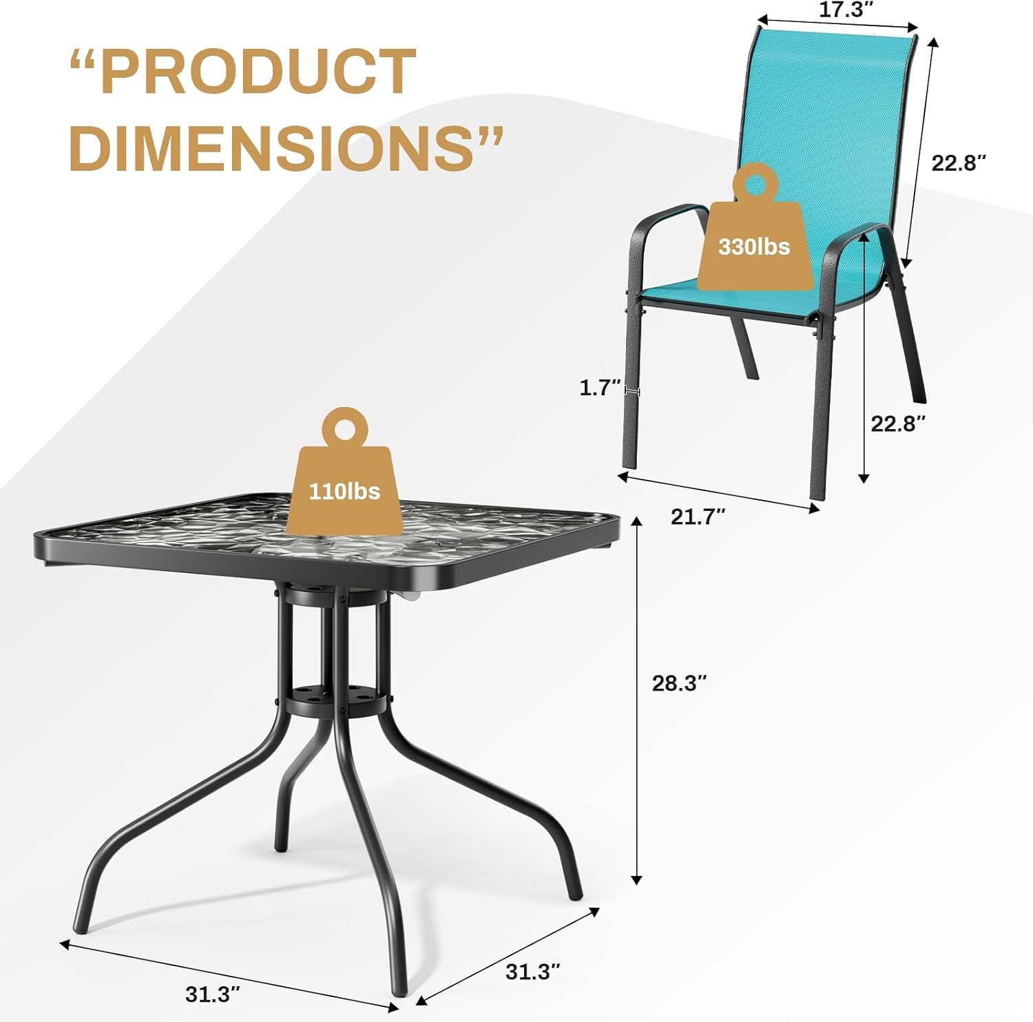 Confortable Size: Square Table Size: 31.3″Lx 31.3″ Wx 28.3H. Chair Dimensions: 21.7″ W, Our table can support up 110 lbs and our patio chairs can support up to 330 lbs.