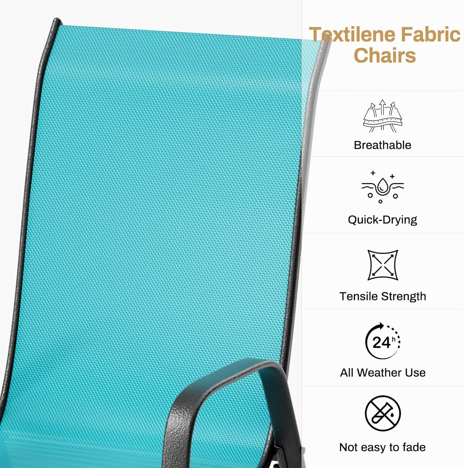 Textilene Fabric Chairs & Ergonomic design: Made from textilene fabric,the four outdoor chairs are breathable, sweat absorption, quick drying, all-weather and not easy to fade.The ergonomic design with high back and head support makes this chair even more comfortable.