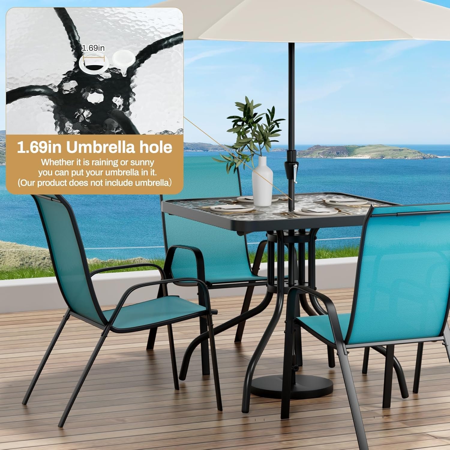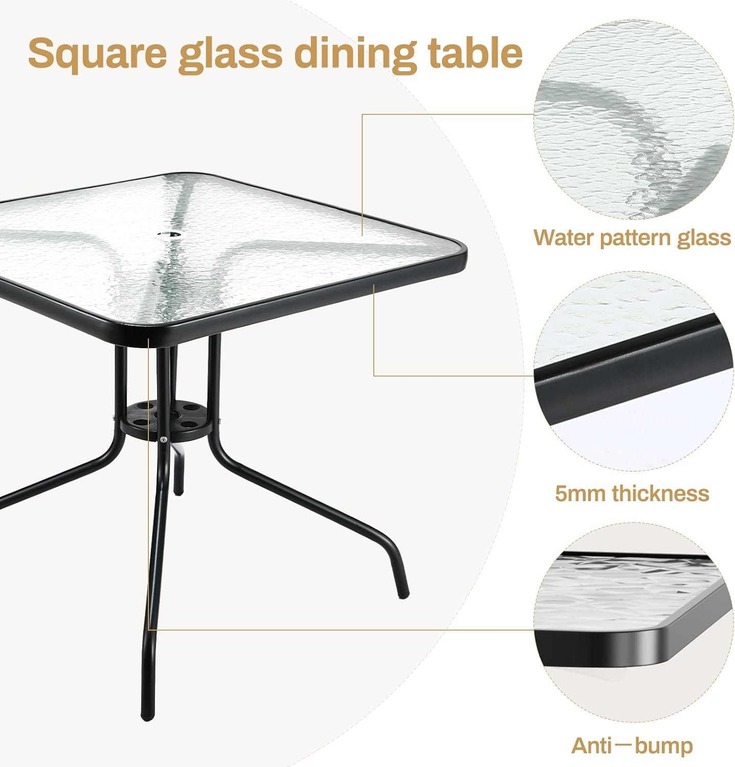 Square Glass Table: Crafted from 5mm thick water patten glass, the patio table with is easy-clean and all-weather used,There is also is an 1.69in umbrella hole on the table,whether it is raining or sunny,you can put your umbrella on it.(Our product does not include unbrella.)
