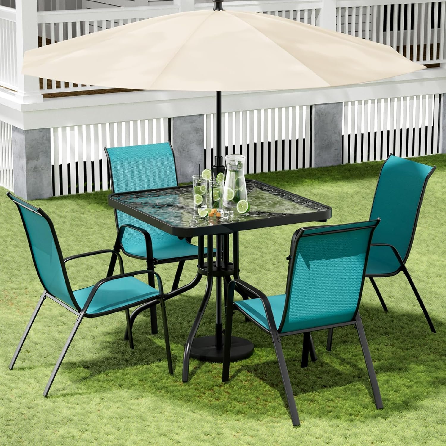 Arlopu 5 Piece Outdoor Patio Dining Set (Umbrella not Included), Porch Furniture with 4 Textline Chairs, 1 Square Glass Table for Garden, Backyard and Poolside, Lawn (Blue)