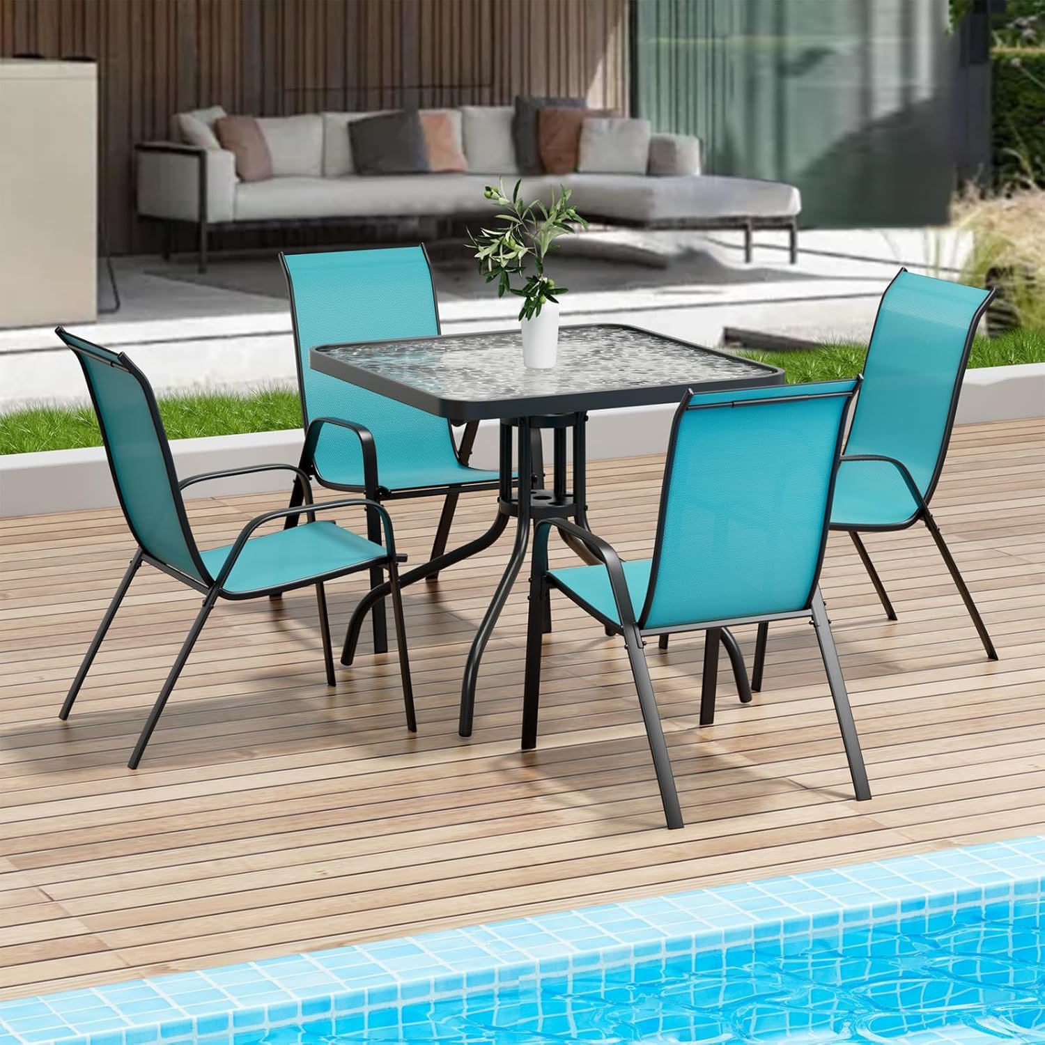 5 Piece Dining Outdoor Set: Patio dining set includes a stylish square glass-top table and four textline chairs, perfect for creating a cozy dining space in your patio, garden, backyard, poolside, lawn and porch.
