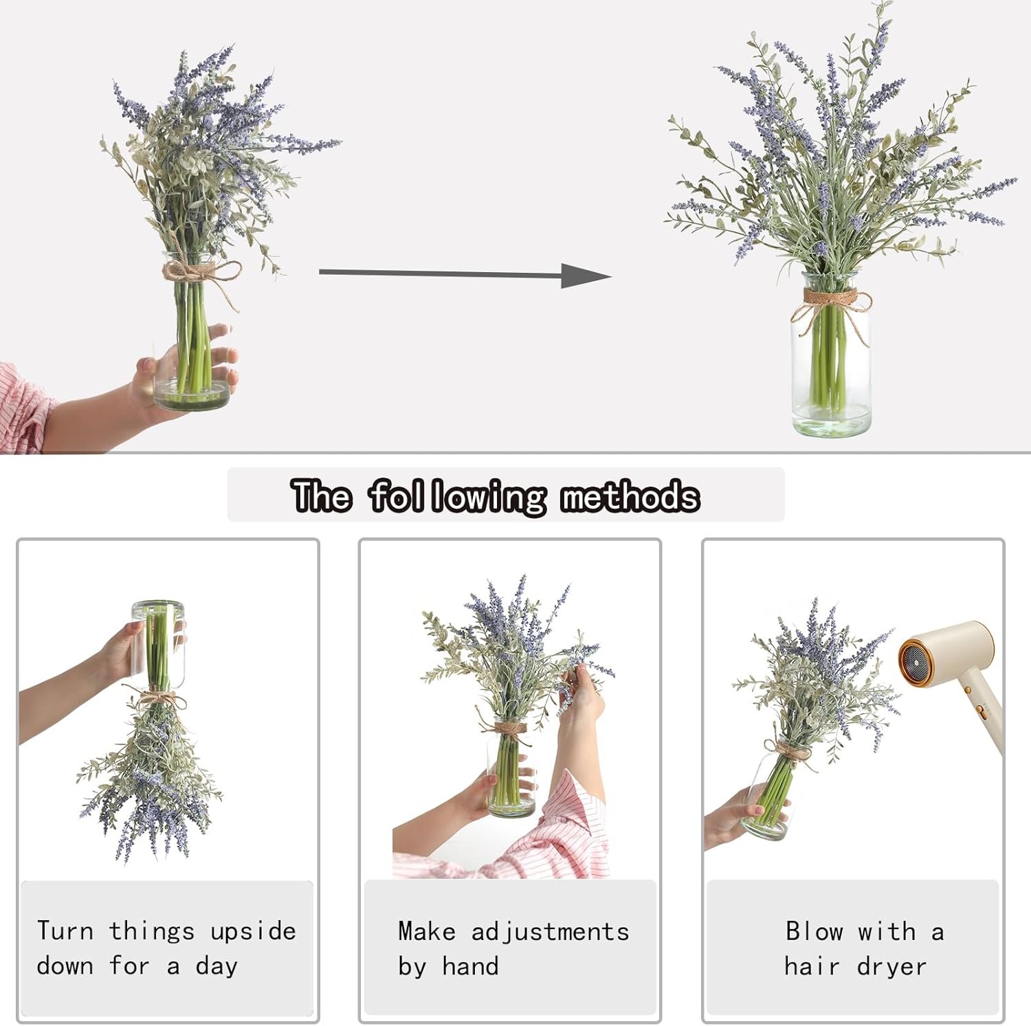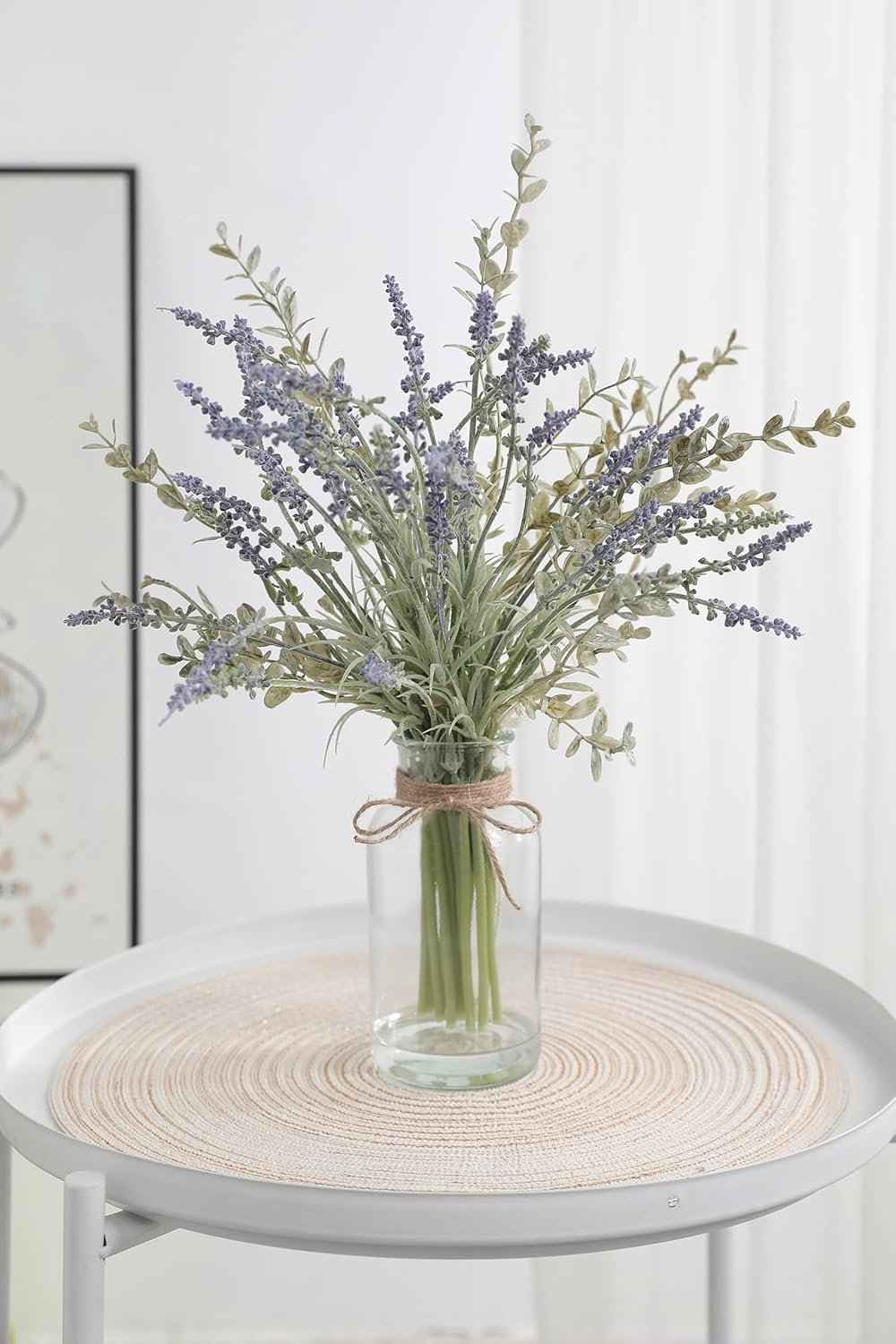 Unique design:Each Lavender stems arrangement comes in a glass vase.Designed with a realistic “faux watered” effect, this greenery fake plants mimics the freshness of recently watered greenery, creating a vibrant, lifelike appearance with fine details and natural color transitions. This fake water firmly holding the stems in place — no rearranging needed, ever.