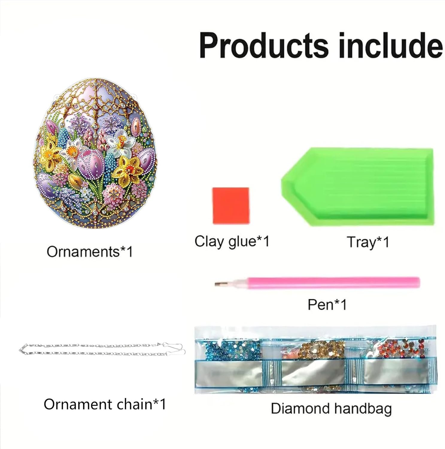 DIY Pendant Ornament: Package of the ornament includes:1 X pendant ornament, 1X chain, 1 X diamond art painting tool kit: Colorful Diamond Bag, Clay Glue, Pen and Diamond Tray