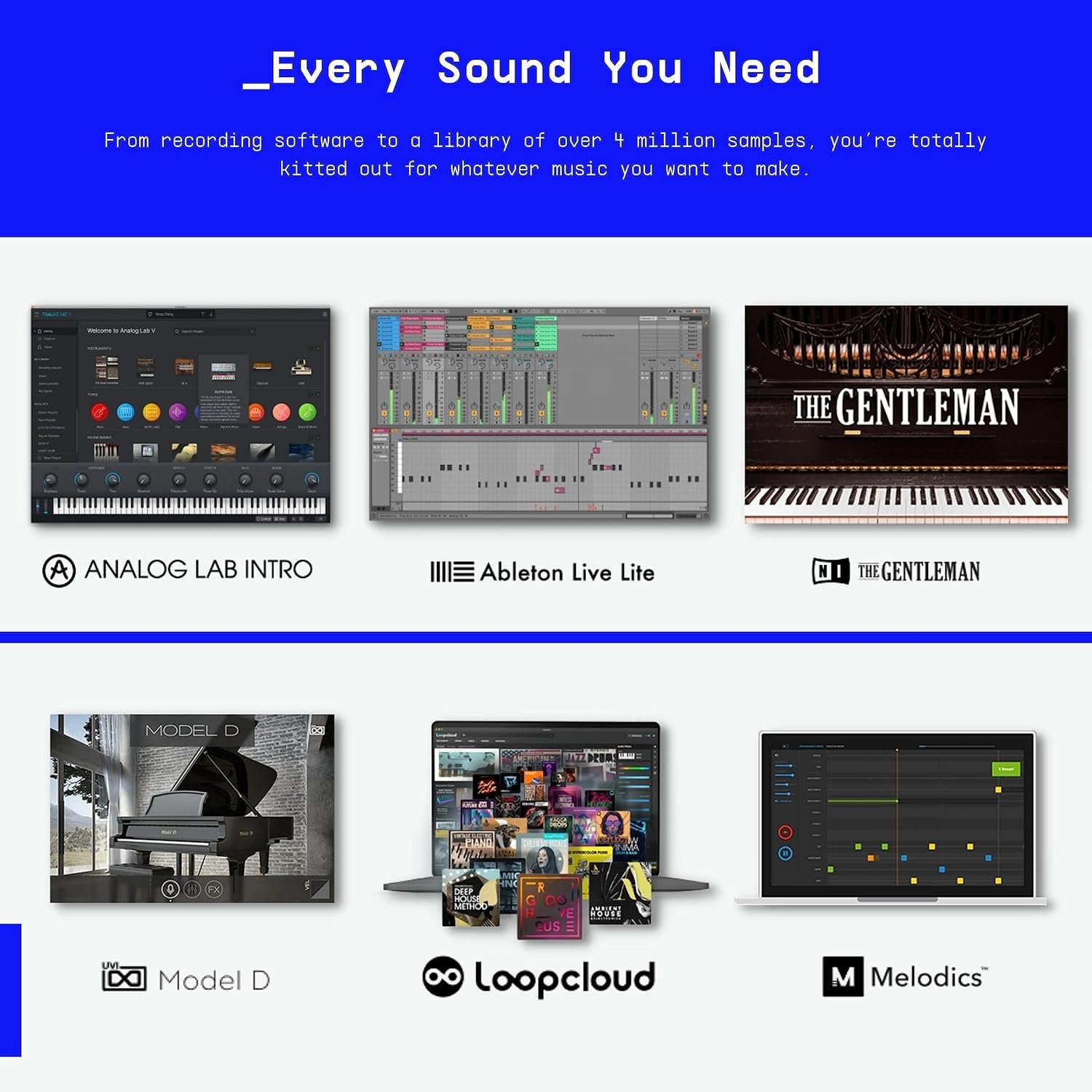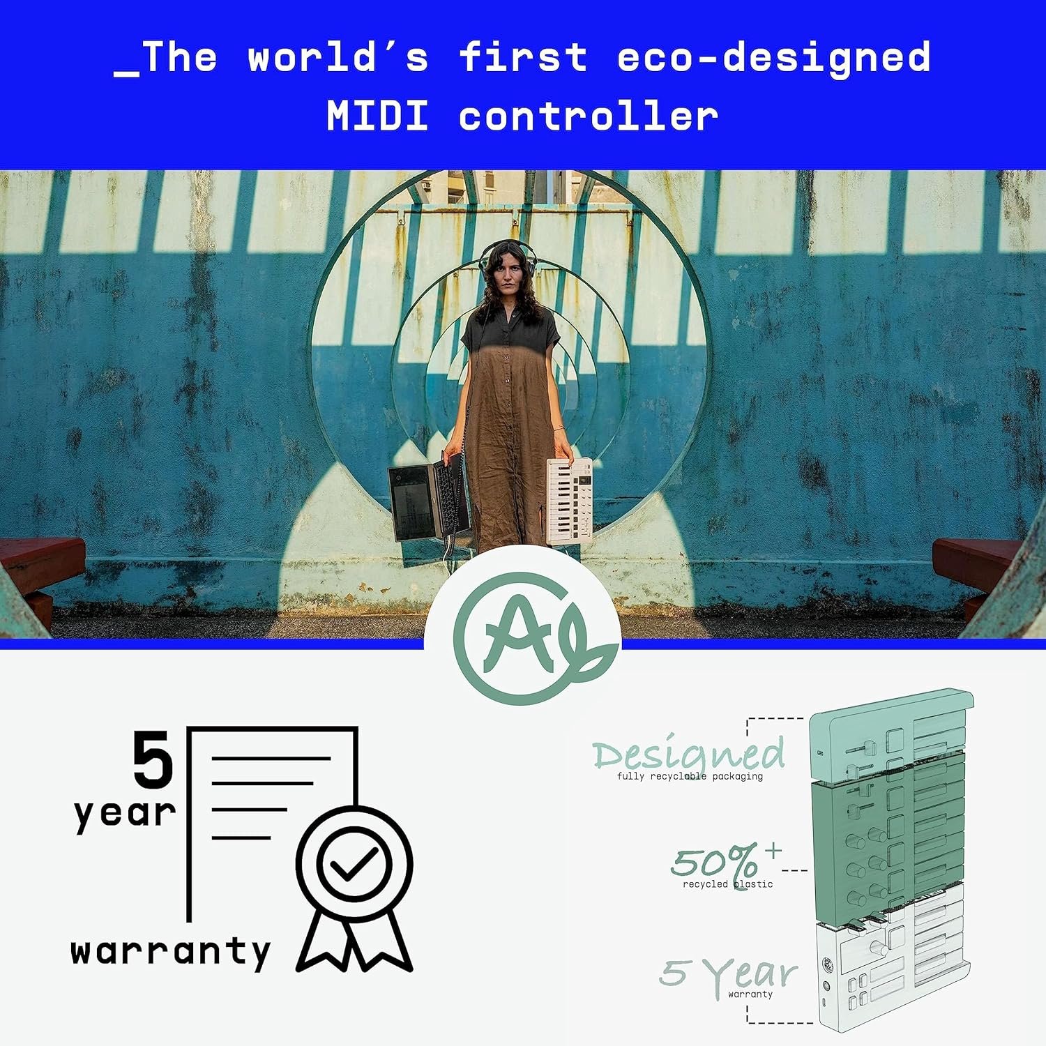 25 Slim-Key USB-C Midi Controller with 5-Year Warranty, 8 Backlit LED Pads, 8 Knobs, 4 Faders, Midi Out, Built-in Arpeggiator, Chord mode and Software Bundle – Deep Black
