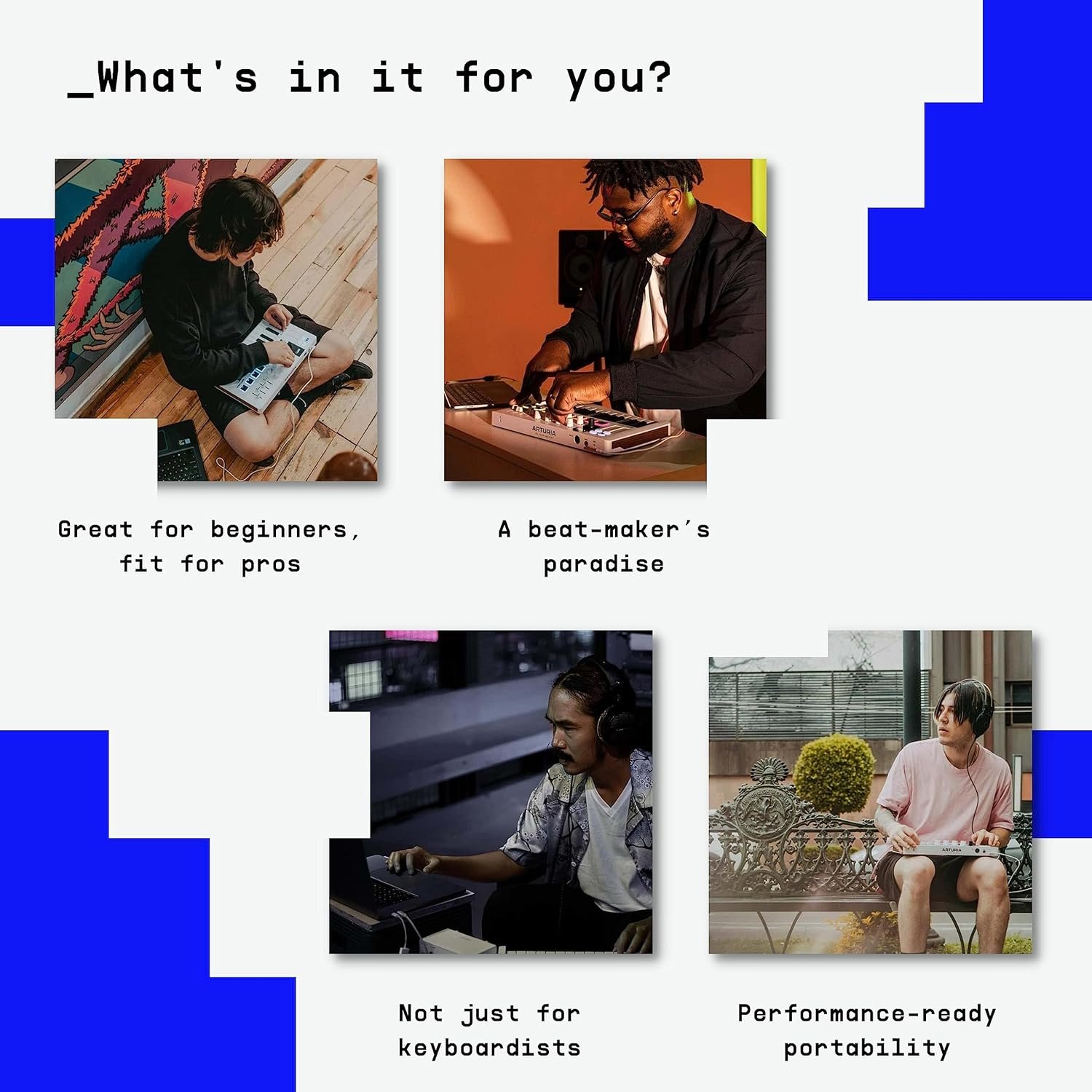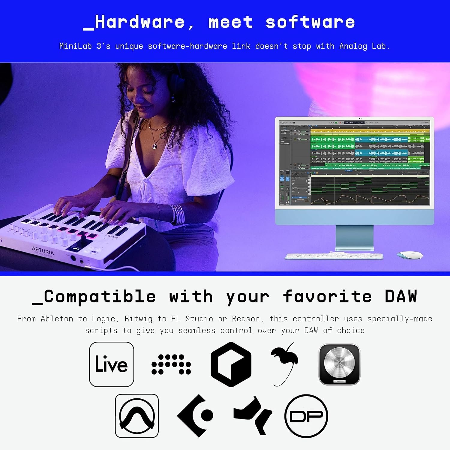 Arturia MiniLab 3, 25 Slim-Key USB-C Midi Controller with 5-Year Warranty, 8 Backlit LED Pads, 8 Knobs, 4 Faders, Midi Out, Built-in Arpeggiator, Chord mode and Software Bundle – Deep Black