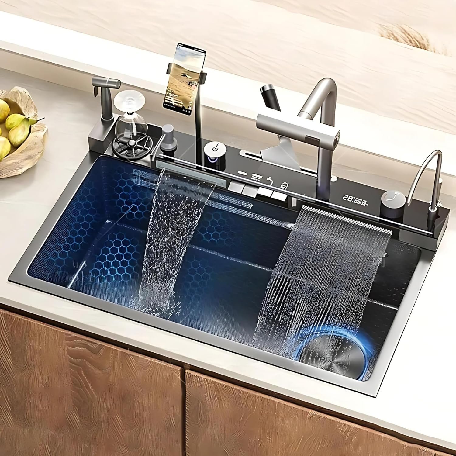 Elegant Waterfall Feature: This waterfall kitchen sink brings a touch of luxury to your kitchen, featuring a gentle waterfall flow that combines style with practicality, making it a centerpiece in any modern kitchen sink setup.