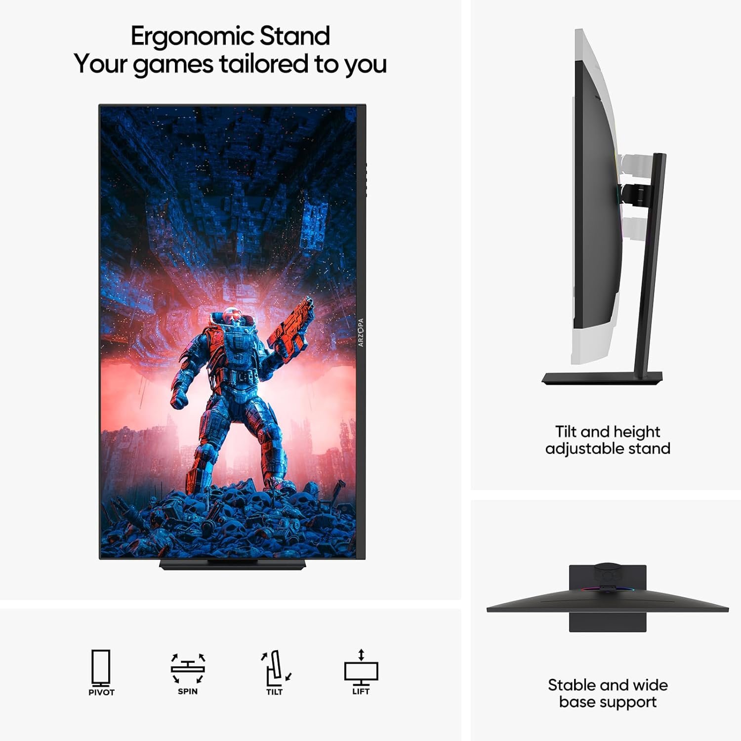 Adjustable Stand: Arzopa gaming monitor features an adjustable stand, allowing you to easily tilt, pivot, and swivel for the perfect viewing angle, promoting comfort and reducing eye strain