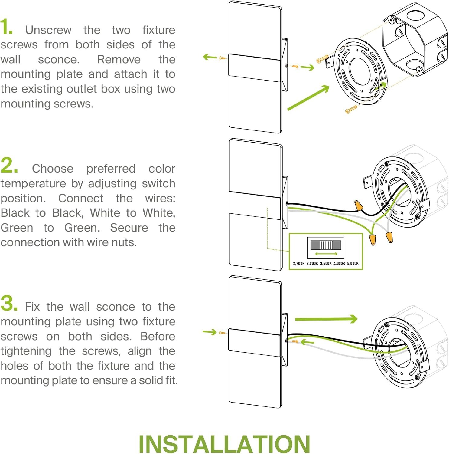 COLOR SELECTABLE: Choose among 2700K Soft White, 3000K Warm White, 3500K Neutral White, 4000K Cool White, or 5000K Daylight color temperatures with a simple switch. The modern hallway, stair and bedroom lights are designed to operate on 120V circuits.