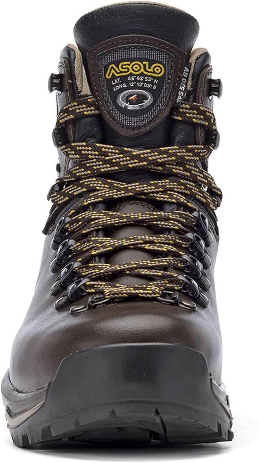 The TPS 520 GV EVO leather hiking boot by Asolo has a tough yet comfortable leather design, excellent waterproof protection, and reliable traction that makes it ideal for backpacking, trekking on technical terrains, and long distance hiking. Designed as one-piece of water-resistant 2.6-2.8 mm full grain leather upper for long-lasting durability. Contains a revolutionary Triple Power Structure (T.P.S.) sole designed by Asolo in partnership with Vibram. GORE-TEX lining with Extended Comfort Footwear technology offers waterproof protection to ensure feet stay dry and comfortably cool. Rubber toe cap. Easy lace-up design that allows for a more preferred fit. Lite 2 footbed has an anatomic construction for excellent underfoot comfort. Dual density PU midsole provides cushioned support. T.P.S. outsole incorporates three shock absorbers that correspond with the areas of foot that receive highest impact during activity thus providing greater shock absorption, comfort and a more dynamic walking solution. Triple Power Structure Evo Asolo/Vibram rubber outsole features self-cleaning lugs designed for optimum performance on varying types of terrain. Asoflex 00 MR lasting board. Imported.