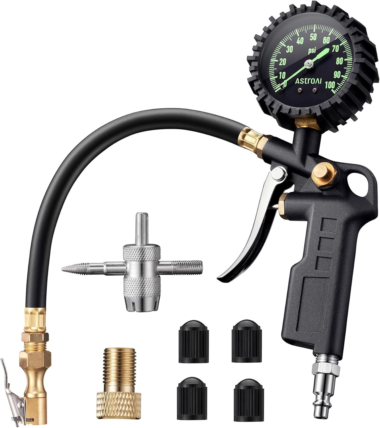 AstroAI Tire Pressure Gauge with Inflator, 100 PSI-ANSI B40.1 Accurate, Large 2.5″ Easy Read Glow Dial, Heavy Duty Air Chuck and Compressor Accessories with Rubber Hose and Quick Connect Coupler