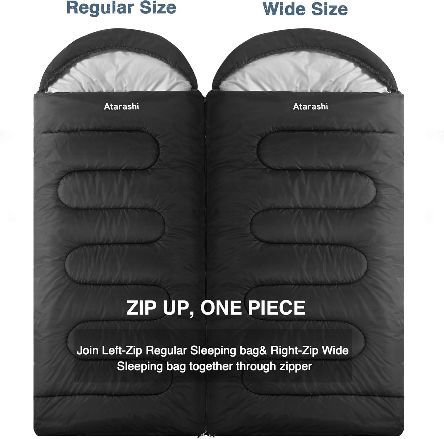 FREE COMBINATION& DETACH – Left zipper allows the regular sleeping bags to be zipped together with a right zipper wide bag to create a double bed; Double sleeping bags can be unzipped and separately zip into two individual sleeping bag. Sleeping bag of all size can unzip into a blanket for car camping
