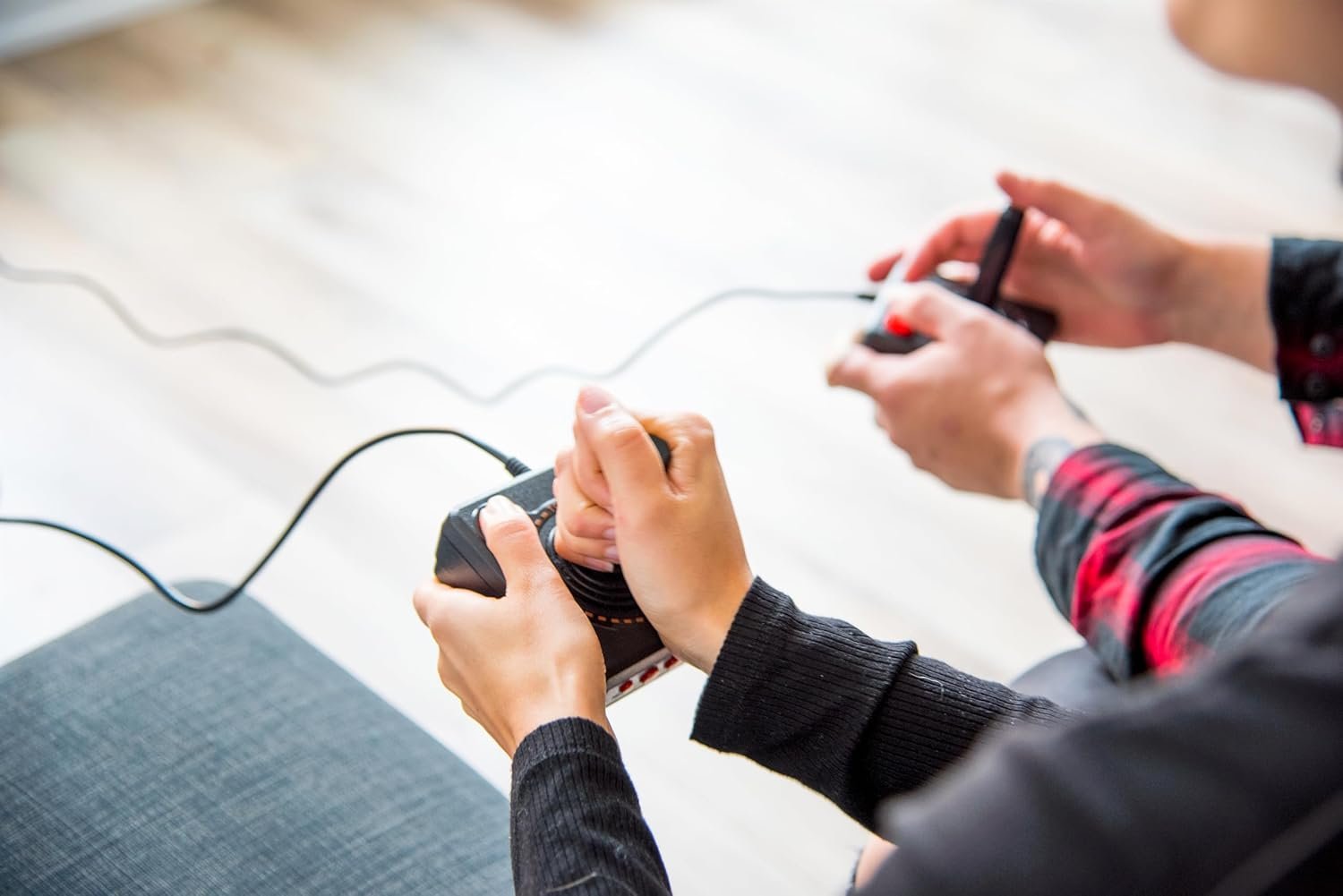 The joystick is wired, not wireless, and includes red buttons on the side. There are no additional buttons. Wired paddles may not have the flexibility to move to the side of the TV, but this is consistent with the original gaming experience.