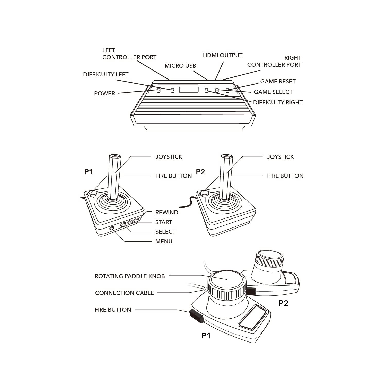 This is a mini console, significantly smaller than the original Atari console. HDMI video output (720P) Plug & Play on HD TV (HDMI cable included). Save/Load/Rewind all games/Powered by Micro USB (adapter included).