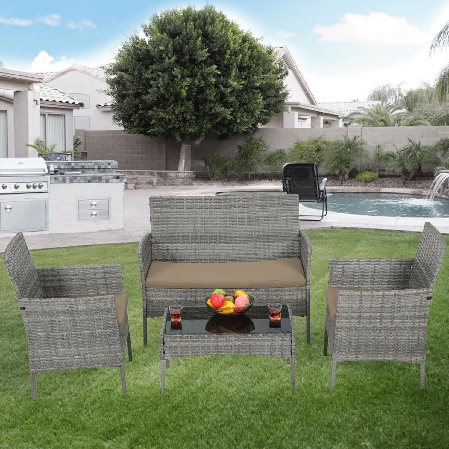 Upgrade your outdoor space with this stylish and durable 4-piece rattan patio furniture set. Perfect for patios, balconies, gardens, or poolside lounging, this set includes a loveseat, two comfortable chairs and a matching side table. Crafted from weather-resistant rattan wicker, it’s built to withstand the elements while maintaining its elegant appeal. The thick, cushioned seats provide plush comfort, making it the ideal spot to relax with a morning coffee or evening drink. The included tempered glass tabletop adds a sleek touch and offers a sturdy surface for snacks, books, or décor.