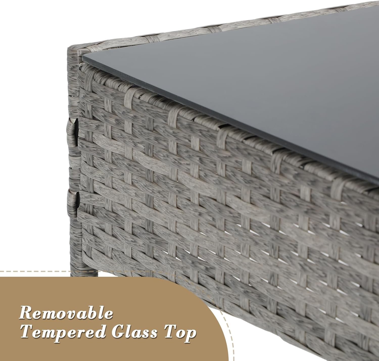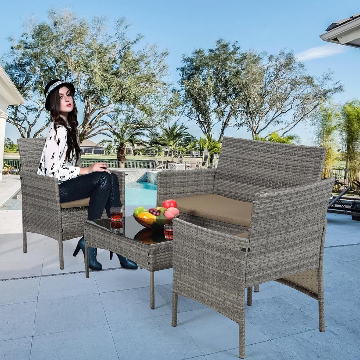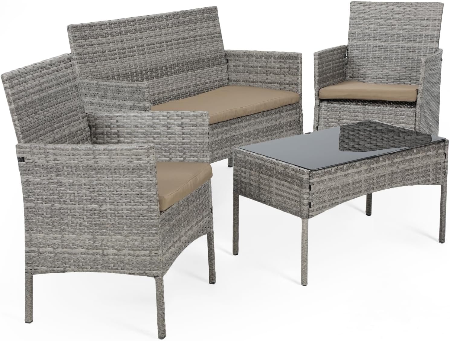 MODERN & STYLISH PATIO SET: This wicker comversation set includes two single chairs, a loveseat, and a coffee table. Its sleek, compact design fits seamlessly in any space, making it perfect for small decks, gardens, poolside areas, balconies, or backyards. The stylish tempered glass-top coffee table adds both elegance and safety.