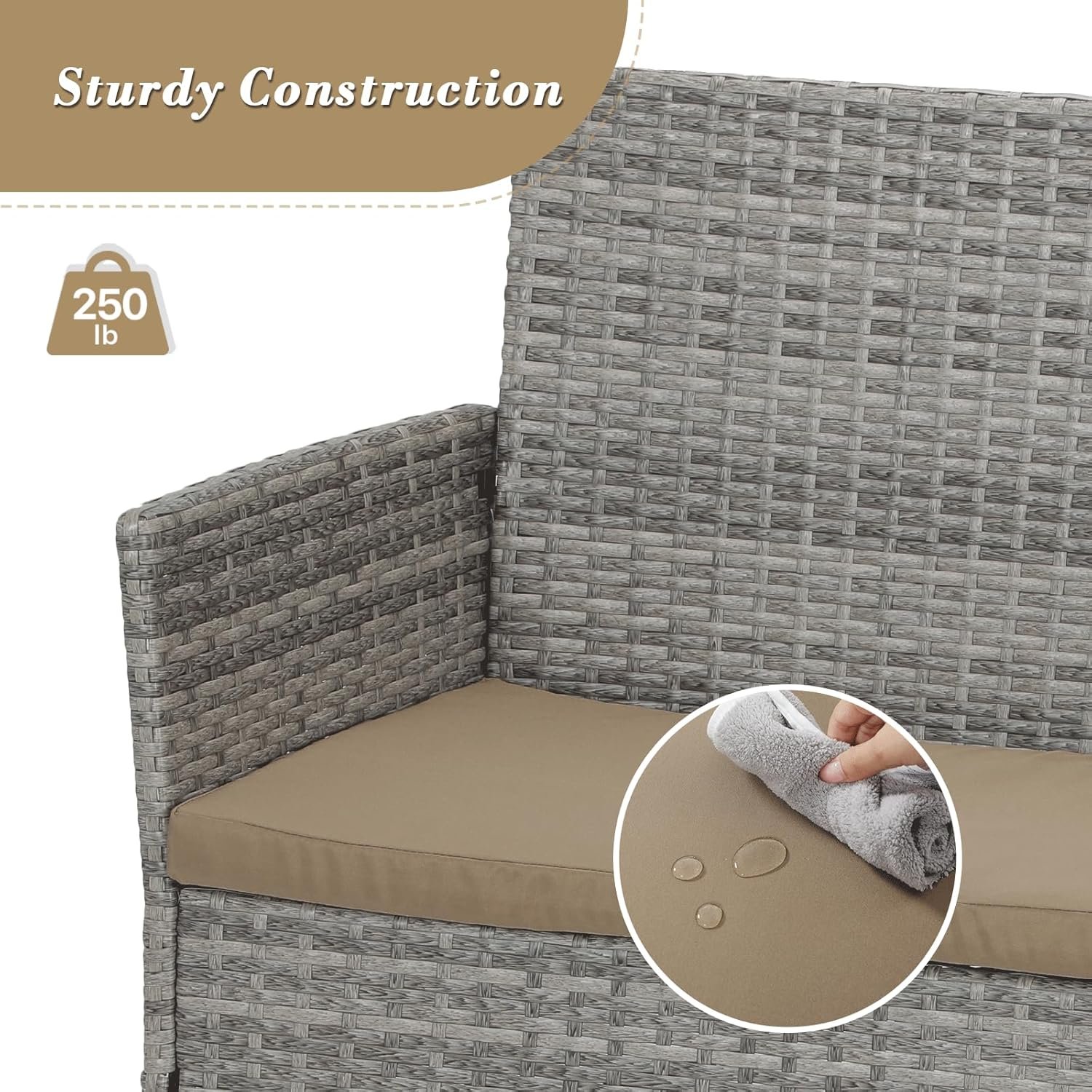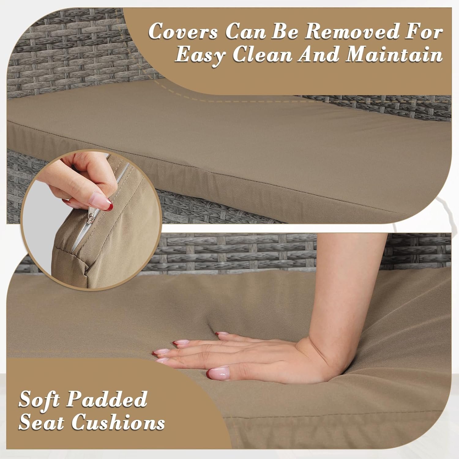 UPGRADED COMFORT WITH CUSHIONS: This patio furniture set includes plush, high-resilience cushions for ultimate relaxation. The waterproof polyester covers feature smooth zippers, making them easy to remove and wash when needed.