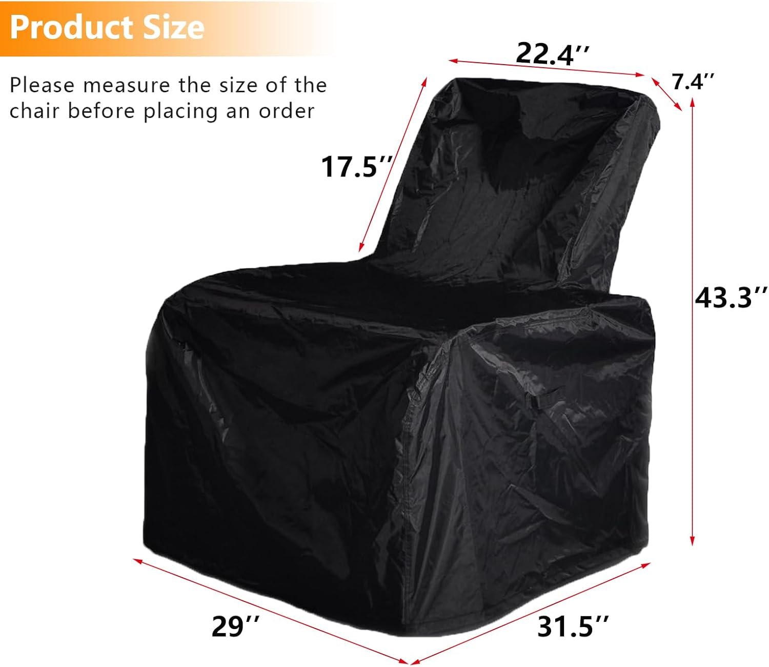 Patio Chair Cover: The patio chair cover measures 31.5”D x 29”W x 43.3”H, for a better fit, it is best to choose a cover that is 1-2 inches larger than your chair. Please measure your patio chair before purchase