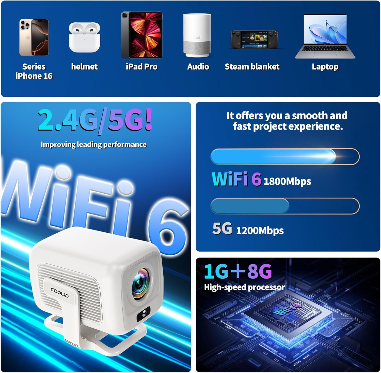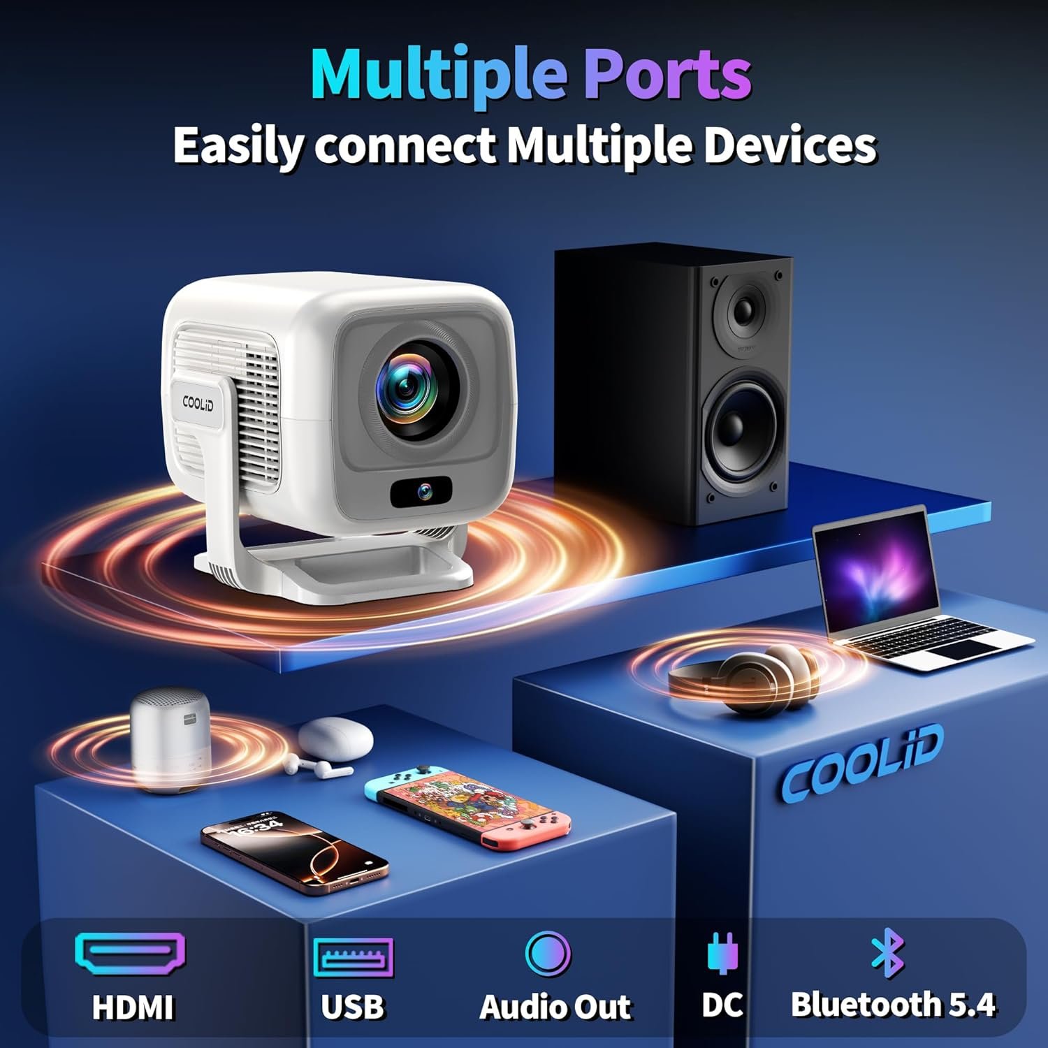 【WiFi 6 and Bi-directional Bluetooth 5.4】The Coolid C3 mini projector features Bluetooth 5.4 and WiFi 6 dual-band technology (2.4GHz and 5GHz), making it easy to connect multiple devices with the latest upgrade. With bi-directional Bluetooth 5.4 audio transmission, you can connect Bluetooth headphones or speakers to use it as a stereo in standby mode and with built-in 360° surround sound for a cinema-quality audio experience. Enjoy seamless entertainment with ease.