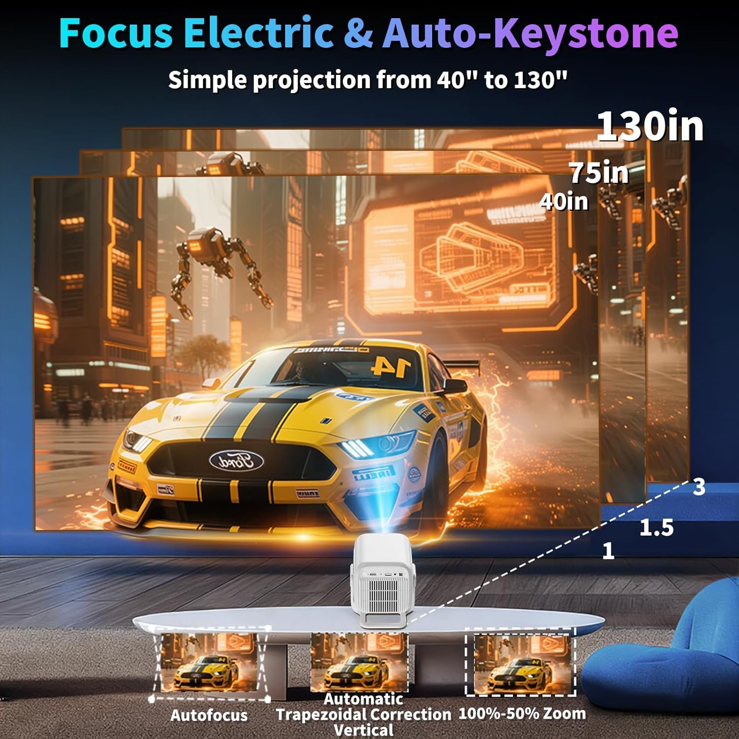 【Flexible Installation、180° Rotatable & Portable Design】The projector supports tripod, ceiling mount and tabletop mounting with standard 1/4-inch screw holes for easy and secure installation. With 180° image rotation, you can project from any angle, while the digital zoom function (35%-100%) and 1.3:1 screen ratio provide flexibility, whether it’s in the living room, bedroom, conference room or outdoors. Enjoy the big screen experience anytime, anywhere.