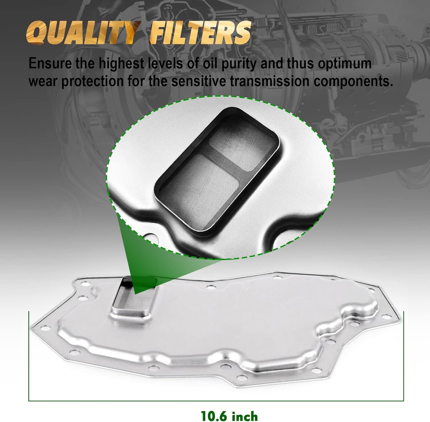 【Transmission Filter Kit】Use high-strength, heat-resistant plastic and premium filter media for maximum protection from debris. protect transmissions from contaminants in the transmission fluid system. Proper filtration helps extend transmission life by minimizing wear and preventing sticking and scoring of sensitive shift control valves. In the event of a component failure, the filter also protects against secondary damage to other parts, helping to minimize repair costs.
